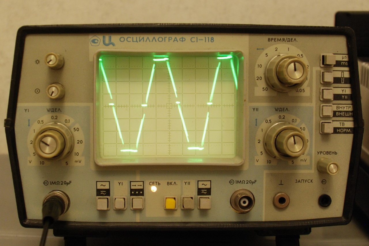 Так что один период сигнала соответствует одному обороту. Сильные наводки от кабеля питания мотора, т.к. фотодиод без всякого усилителя.