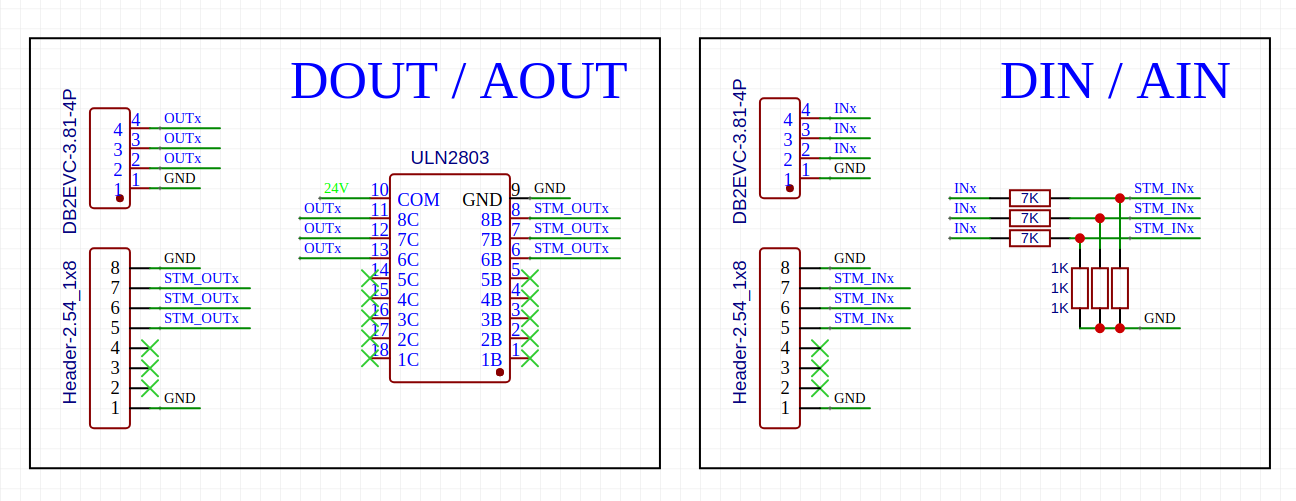 Хочется подключать устройства с разными уровнями сигналов (24V, 3.3-5V). С цифровыми сигналами всё понятно. Аналог 0-24V на выход реализуется высокочастотным ШИМ. Аналог 0-24V на вход - парой резисторов. Пример на картинке ниже. Всё, что подключается напрямую к STM'ке, начинается с префикса STM_. Если видны ошибки, напишите