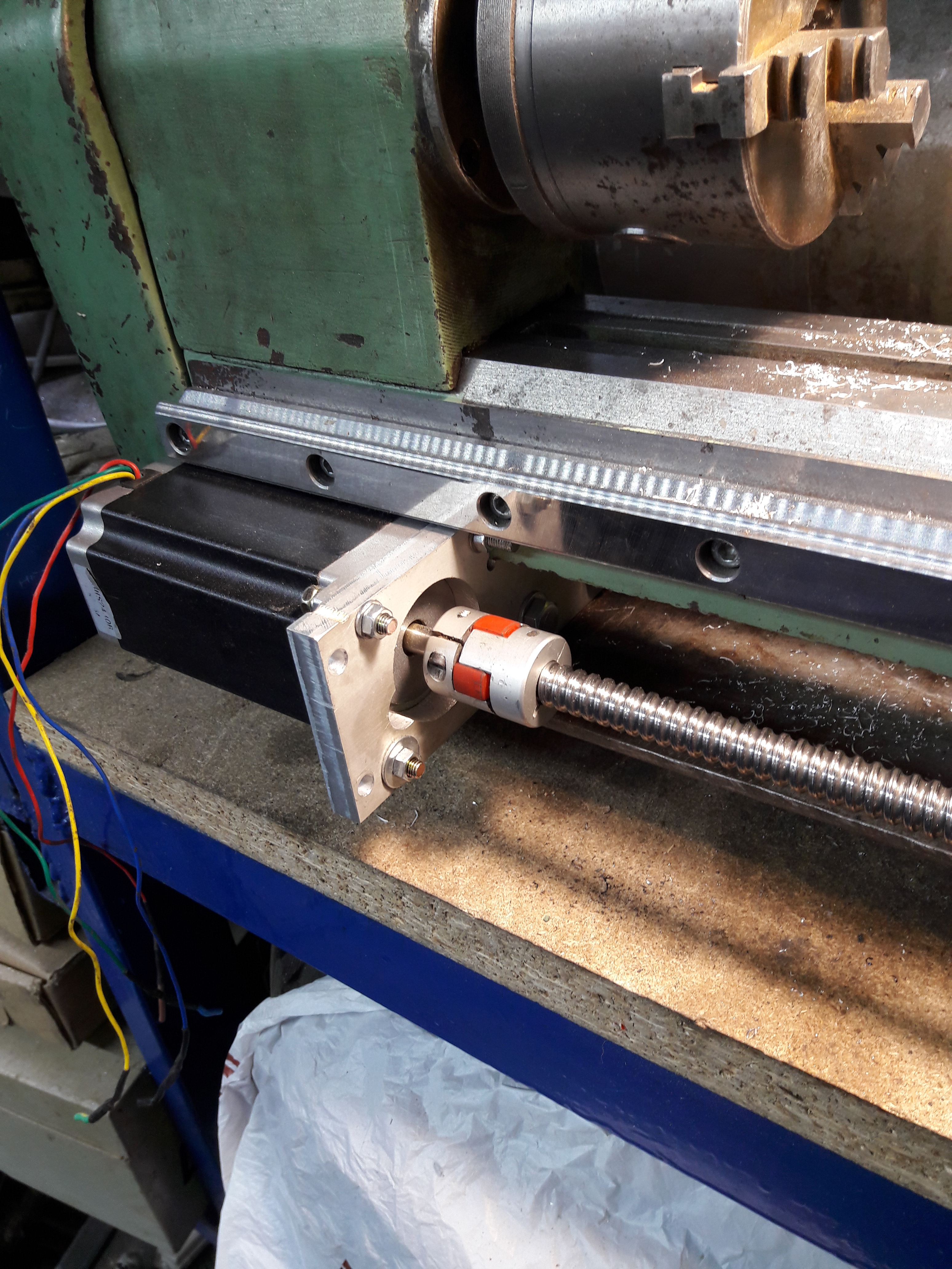 Не спешно начал переставлять "электрогитару" . Станок далеко не супер-пупер ,но мне вроде достался достаточно удачный , сталь режет и даже отрезает , много косяков , материальчик так себе ,задняя бабка хиловатая . С "родной" продольной работать можно ,но это мУка ! Шестерёнки сразу снял в ящик , крутил винт за ручку . И вот теперь поставил ШВП и вот он кайф ! Шаговики ,шкивы и ремни это пока макетирование , а то некоторые подумали ,что я станок из ламината строю ! :hehehe: