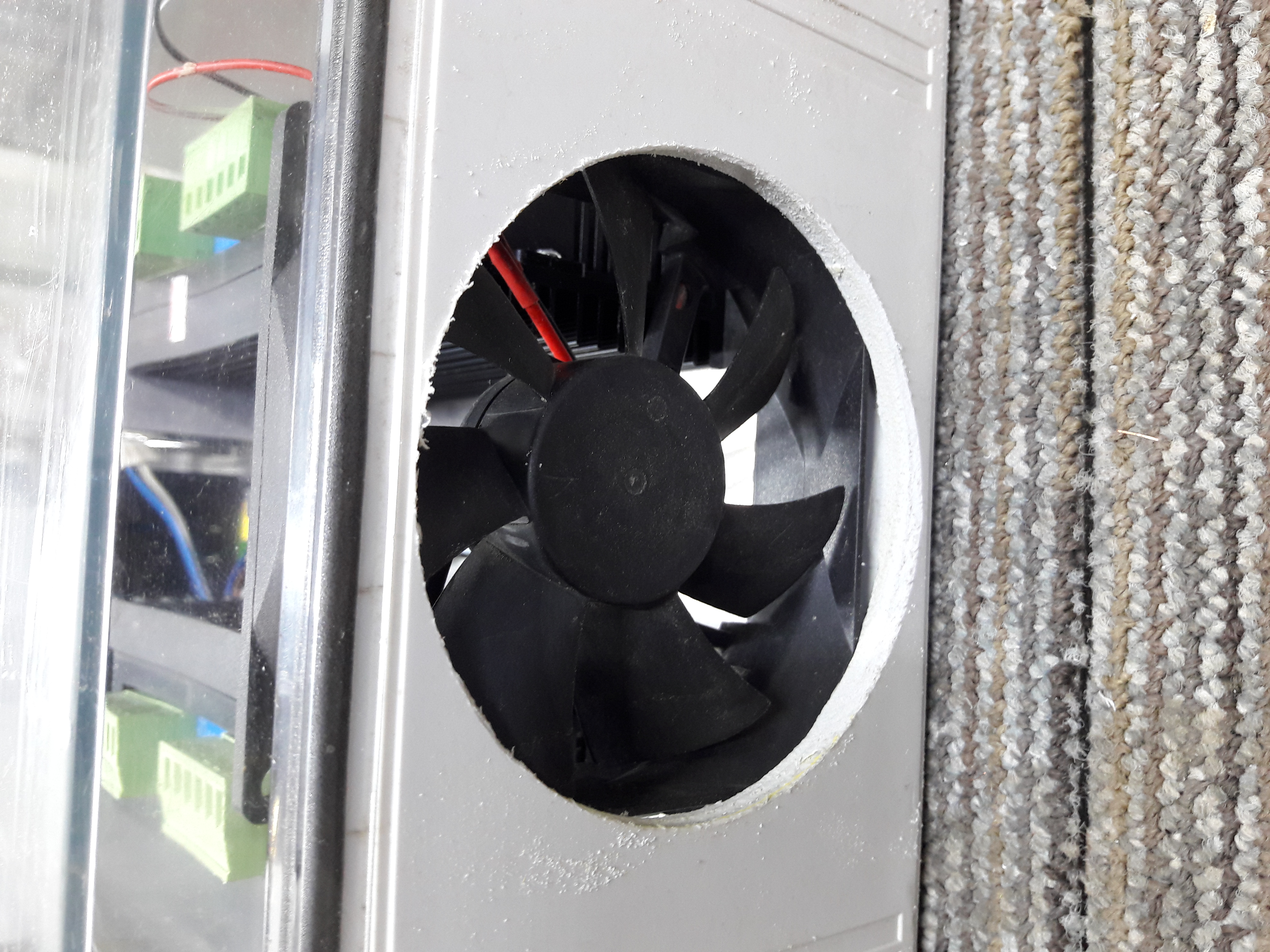 Скомпоновал окончательно электрошкаф .Почему то в блоке питания вентилятор стоял на выдув ,я перевернул на всякий случай . Добавил блок питания на 7 вольт для ардуины и 3х ваттный леддрайвер прекрасно крутит кулер ! Частотник выводит на табло температуру так что можно будет ориентироваться по нему .