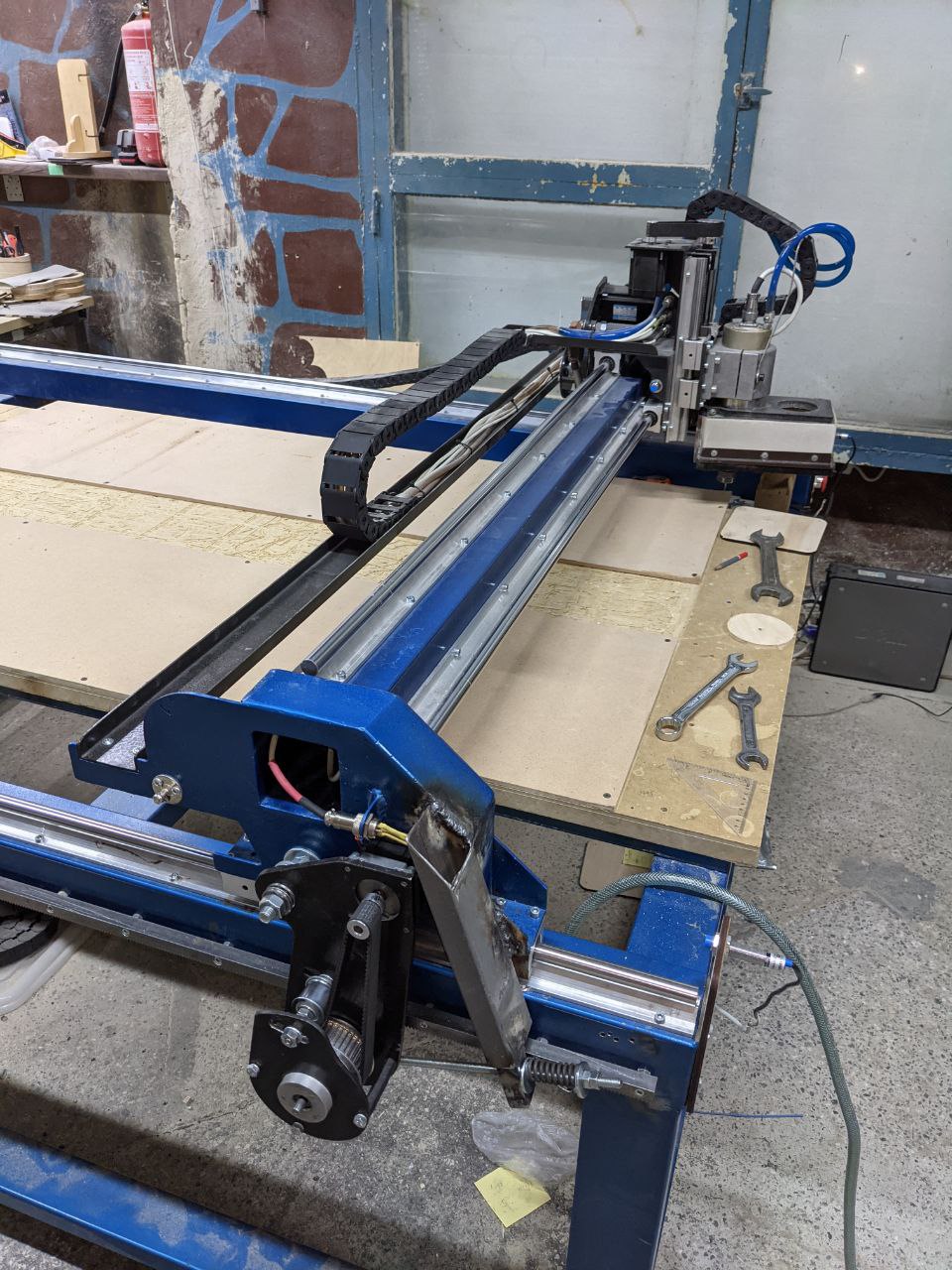 Самодельный, 1х2м, реечный привод, редуктора ременные (фото прикрепил) по всем осям, нема23*50, драйвера dm556, заземлен, провода экранированы, управление Mach3, плата LPT