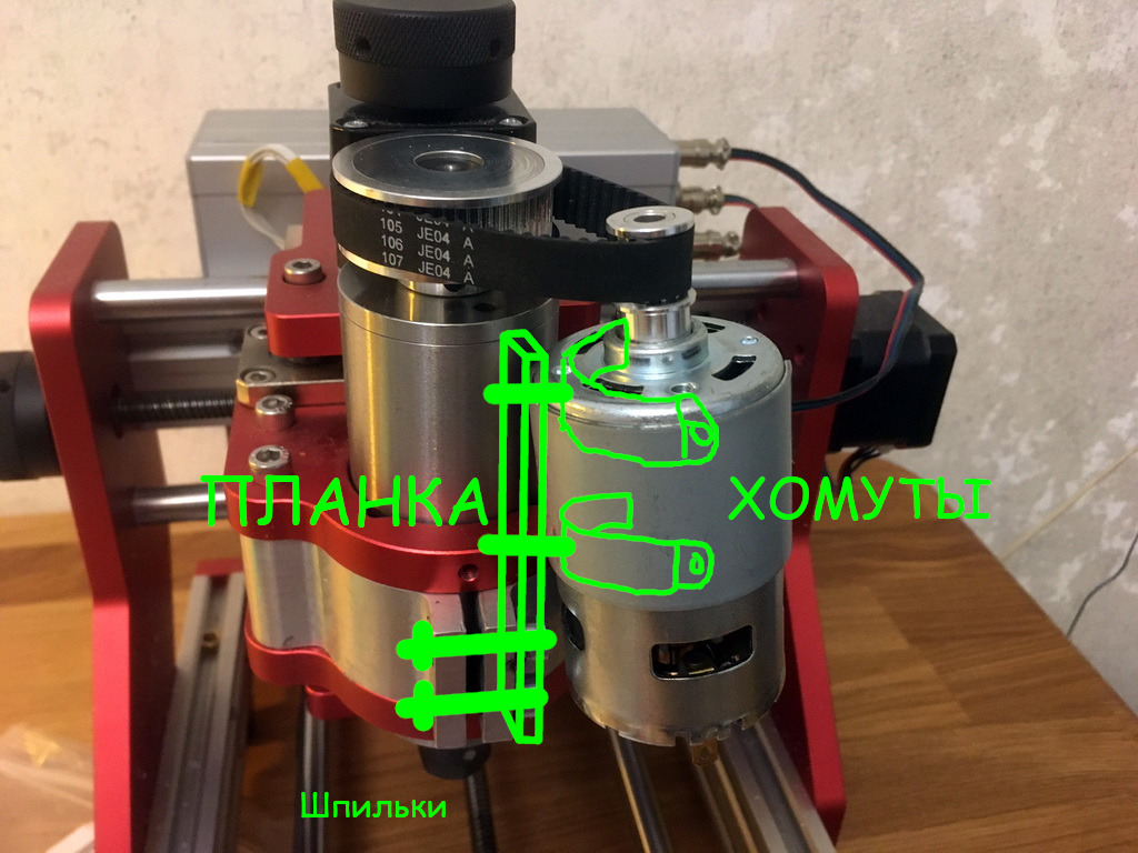 Об этих хомутах речь: Можно планку перекинуть на противоположную сторону, будет место для устройства регулировки натяжения ремня(если вдруг приспичит) с помощью перемещения гаек по шпилькам закрученным в хомуты.