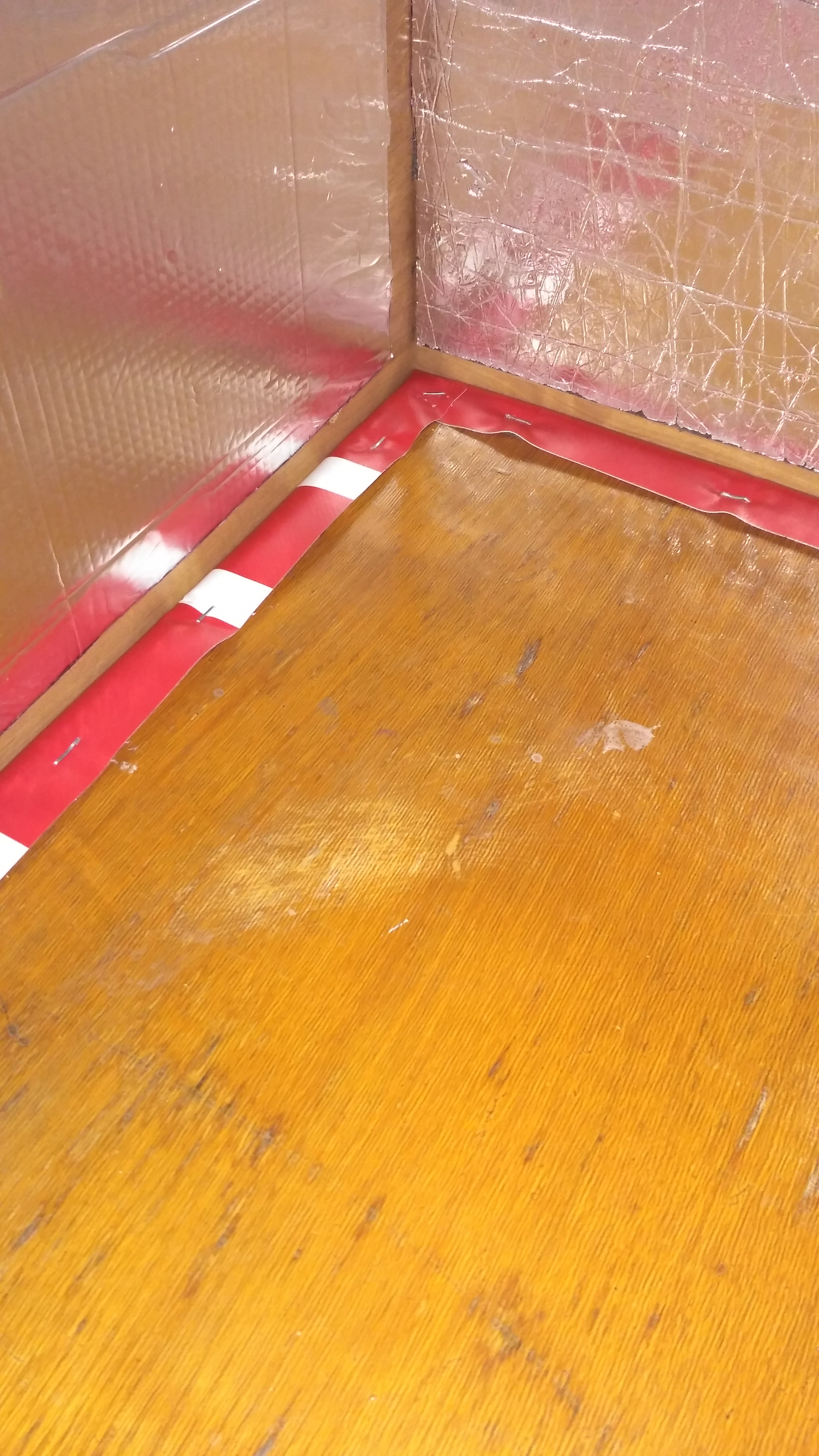 Обшил дно по периметру банером с пеной. Получился мягкий бортик, не рвется при надевании стенок. Заодно перекрыл щель между полом и стенкой.