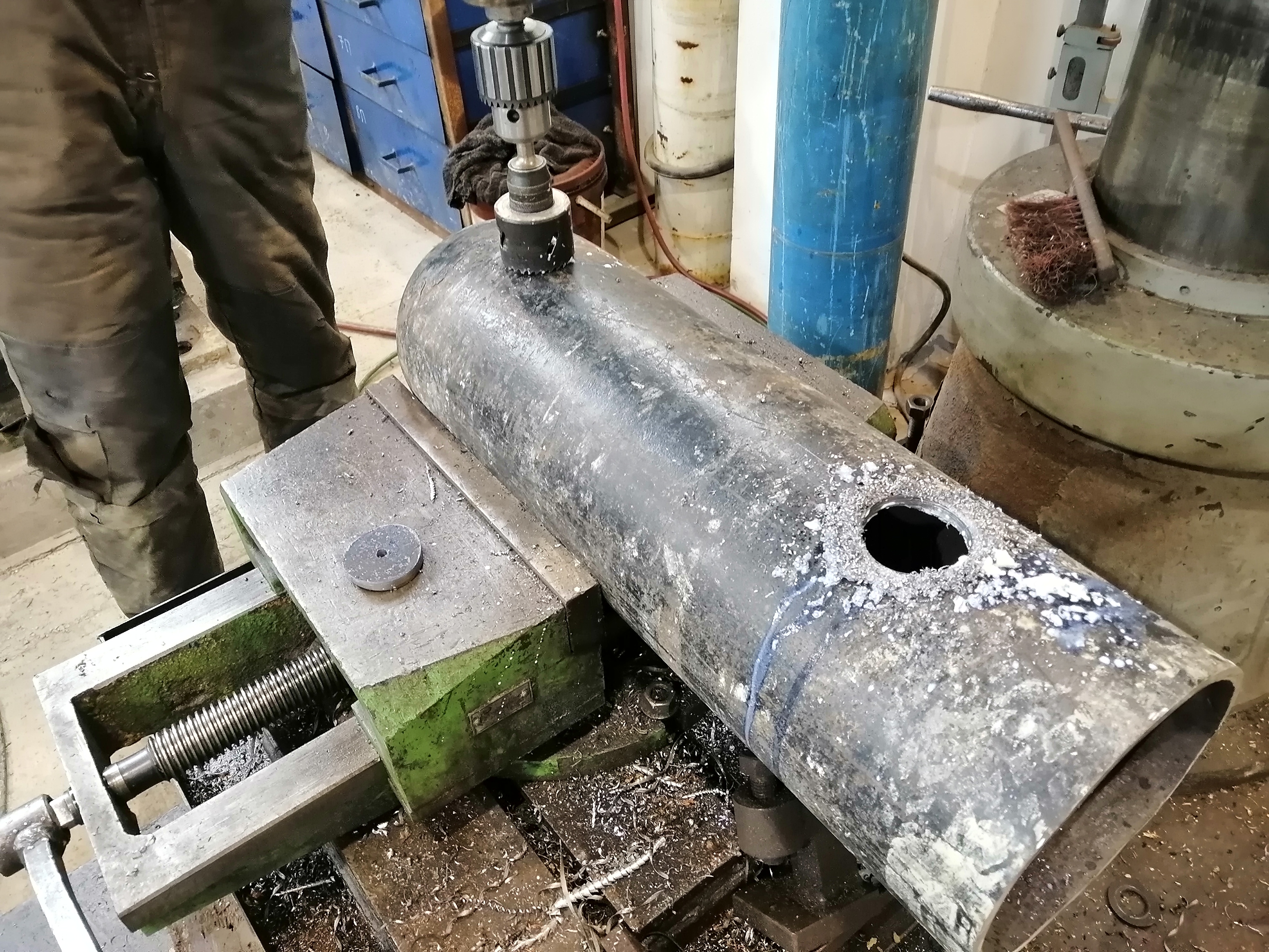 Были нарезаны трубочки Ф57 из стали в качестве корпуса и трубочки Ф50 из канашной пластиковой трубы в качестве защитного вкладыша, чтобы не царапать конусы. Ну и из этих заготовок были изготовлены чудесные держалки под КМ5. Тем кто будет повторять обращу внимание на то, что донца не заварены а специально приварена труба 16х16, чтобы всякий мусор свободно высыпался из стакана а конус провалиться не мог.