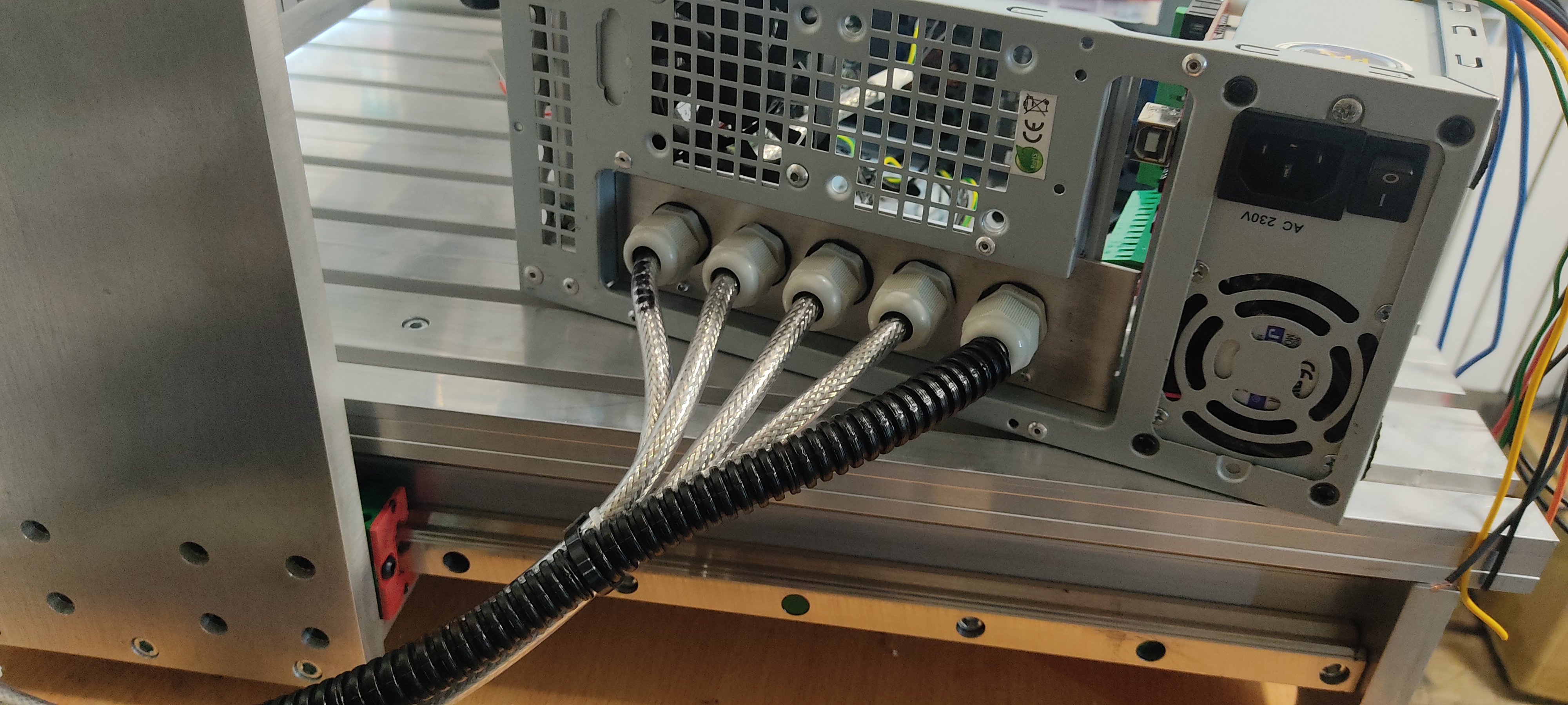 Нашел миниатх корпус с блоком бп. Тут поподробнее. Изначально хотел шаговики питать как привык от 12в, тогда компьютерный бп подошел бы как основной. Позже решил питать шд и плату мач от 24в, так пощность шд будет повыше и меньше вероятность пропусков на высоких скоростях. А для чего тогда компьютерный бп? А для питания реле, через которое будет проходить 220 на всю электронику (бп24в и частотник шпинделя), и кнопка аварийной остановки соответственно будет управлять этим реле, т.е. при ее нажатии будет обестачиваться как шаговики так и шпиндель.