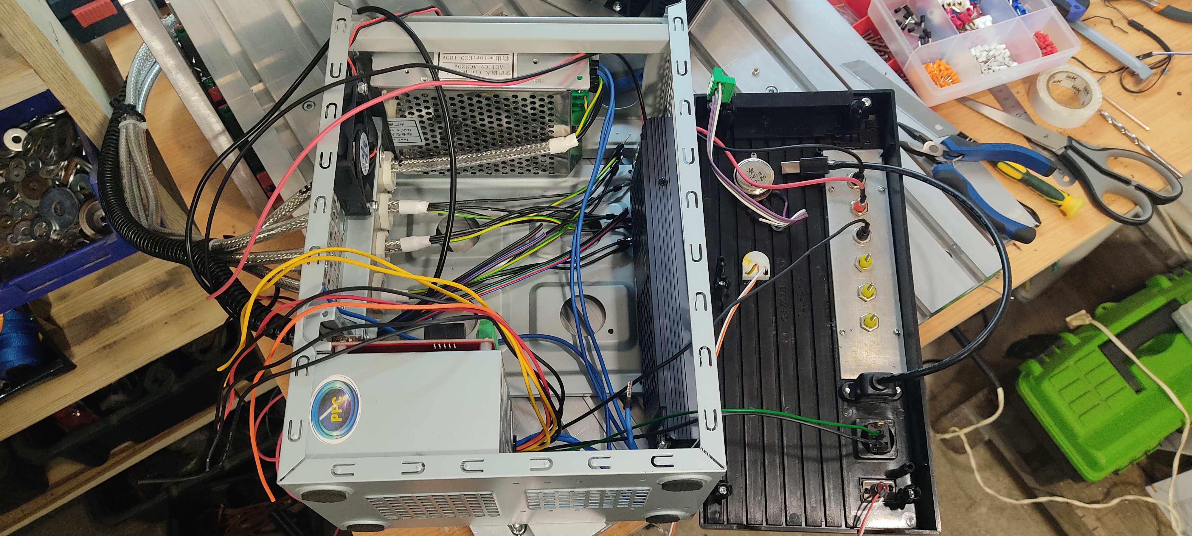 Немного распотрошил компьютерный бп, обрезал лишние провода. Оставил выходы на 3.3в 5в и 12в. Провод активации бп выведу на кнопку включения на корпусе. 12в питание реле, подсветки. И еще, отдельно на клеммы выведу все три напряжения (возможно еще и 24в). Зачем. А часто бывает нужно подключить/проверить что то на 5/12в. Т.е. хочу совместить и блок с электроникой для станка и универсальный бп
