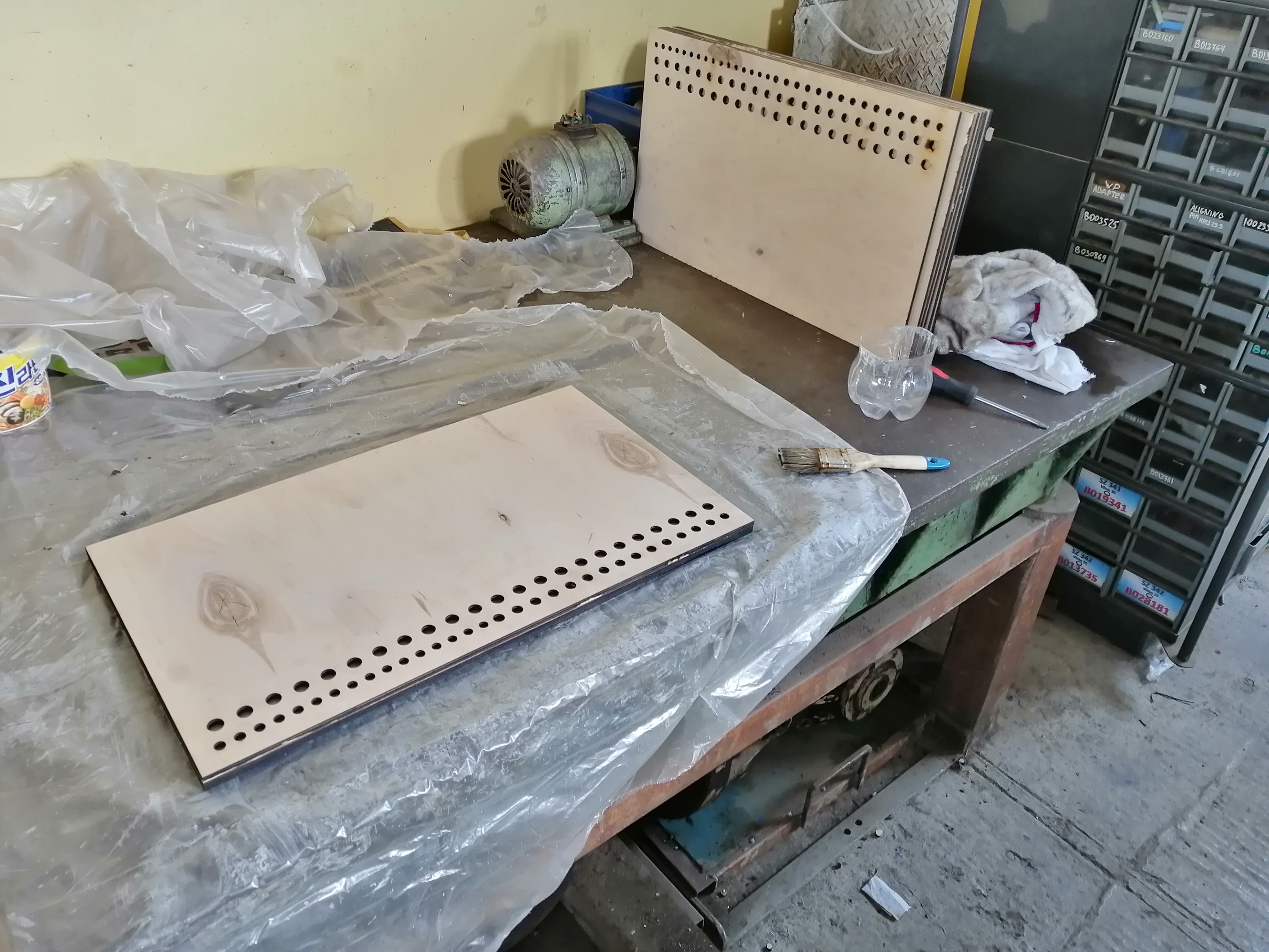 Вчера сходил на работу и покрасил готовую часть тумбочки, а то руки не доходят а спотыкаться о разложенные инструменты надоело. Решил по ходу сборки тумбочки сразу всё раскладывать, что возможно.