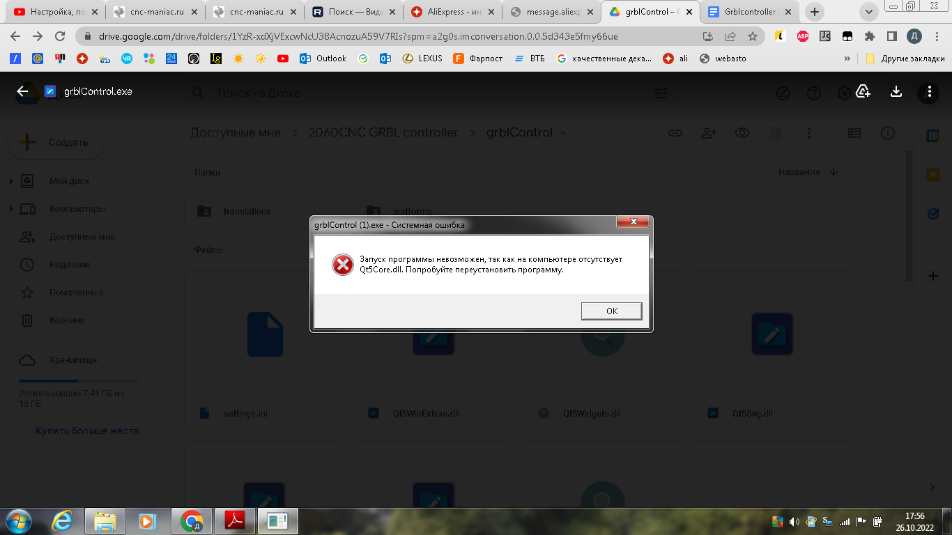 Там внутри в сообщениях, если доступно, все описание подключенияНовичок1 писал(а): ↑31 окт 2022, 22:45https://msg.aliexpress.ru/?spm=a2g2w.or ... 1591368511kfmut писал(а): ↑31 окт 2022, 22:27Так не бывает, драйверы шаговых моторов только с силовым питанием работают. Ссылкой киньтесь на мануал к станку или тут к сообщению прицепите. И настройки grbl-прошивки бы неплохо поглядеть, если в прошивке стоят шаги на мм с учётом деления шага, а на плате задан перемычками целый шаг, то движки могут странные звуки издавать. Если на оси два мотора стоят, то ещё посмотрите, что они оба в нужную сторону крутятся(нужно скинуть при этом ремни или ослабить муфты до винтов).