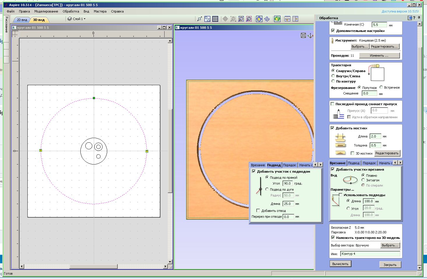 бзики отчасти убираются, тем, что фреза по спирали обрабатывает материал, к сожалению по спирали не получается сделано на выемке под бошку винта (см мой код) там 6мм.