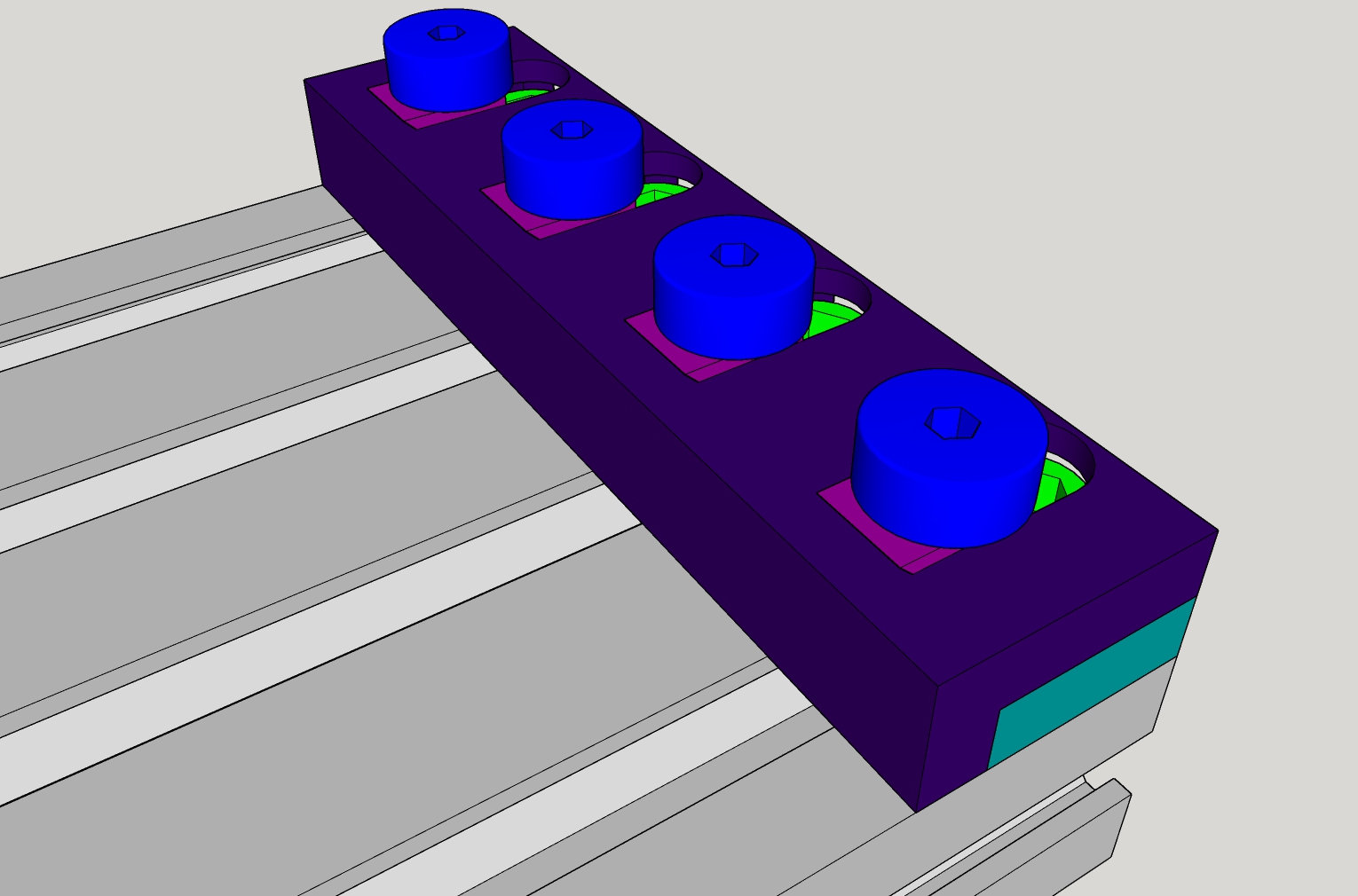 У кого какие мысли о такой конструкции низких тисков? Высота всего 10мм, прикрутить к столу можно нейлоновыми болтами (зеленые на картинке) через диэлектирическую подложку (она же жертвенный стол будет) - таким образом не будет контакта с корпусом и можно свободно снимать карту высот на металлических деталях. Прижим идет болтами из нержавейки (синие на картинке) через косой сухарь из алюминьки. Угол наклона сухаря 45 градусов.