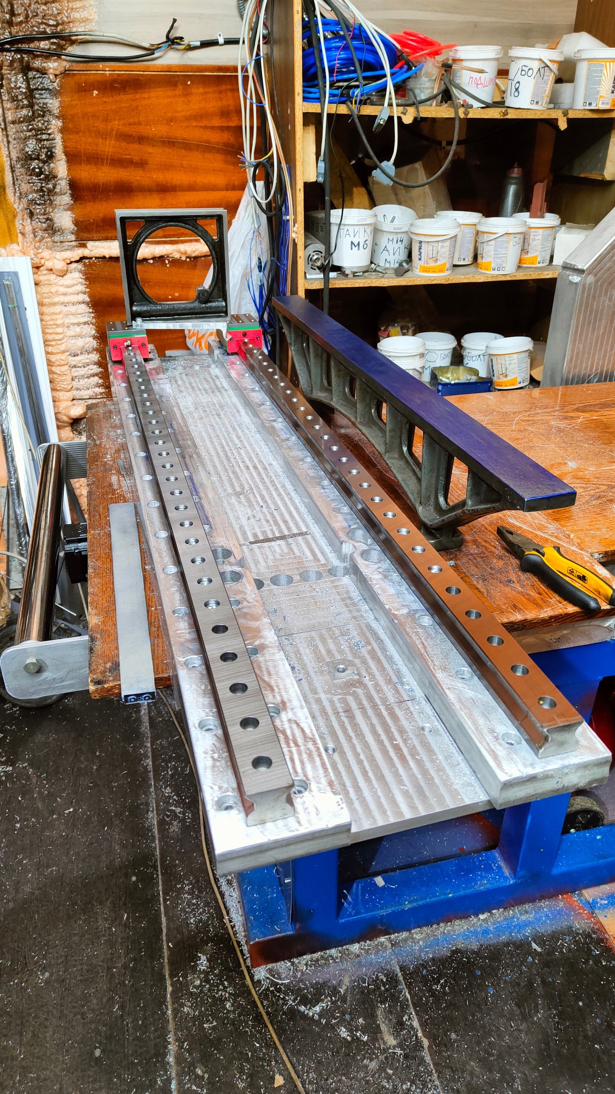 Закончена работа по выставлению рельс основания и рельс балки портала, на основании пришлось прокладывать неровности фольгой. Балку набрался терпения и вышабрил, было дольше но получилось точнее на основании был большой винт и шабрить его было неудобно поскольку было не убрать ничем еще шереховатость в центре плиты. Балку я в итоге прогнал на своем фрезере, стало чуть ровнее разброс вместо 0.15 получился 0.09 что заметно лучше, убрал задиры и шабрить было попроще. Теперь предстоит тяжелая работа по установке были так как это перпендикулярность по нескольким осям , и винт по балке, так как несмотря на ее толщину , стоит подложить под один из краев щуп в 1мм , рамный уровень 0.1 уже показывает винт в 4-6 делений шкалы.
