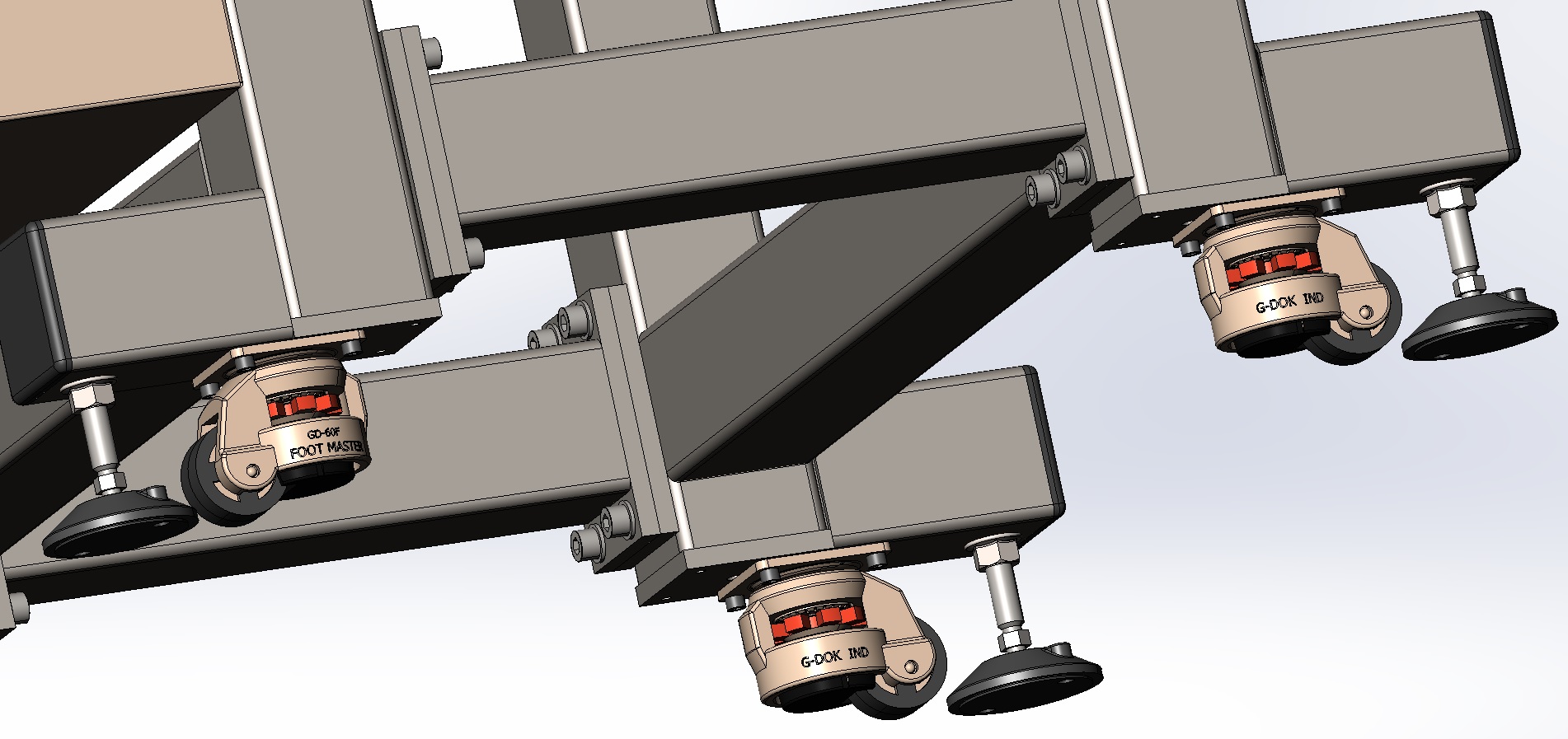 1.1 Всё-таки решил добавить опоры а колесики сдвинуть - паспортная нагрузка на колесо 280 кг, на 4 шт рекомендованная 500 кг, да и то что в них есть определенных люфт мне не нравиться, поэтому решил все-таки поставить полноценные опоры (900 кг на опору), а колеса сохранить для перекатывания. Вес станка целиком порядка 480 выходит по данным Solidworks (сейчас модель весит 388 кг, но еще свои 90 наберет как с куста, если не более выйдет - это полный вес со сварной столешницей под станок), так что колесики по идее будут работать на пределе указанного веса и и даже можно сказать за гранью, поэтому кататься на них аккуратно и потом по месту сразу на опоры загонять.