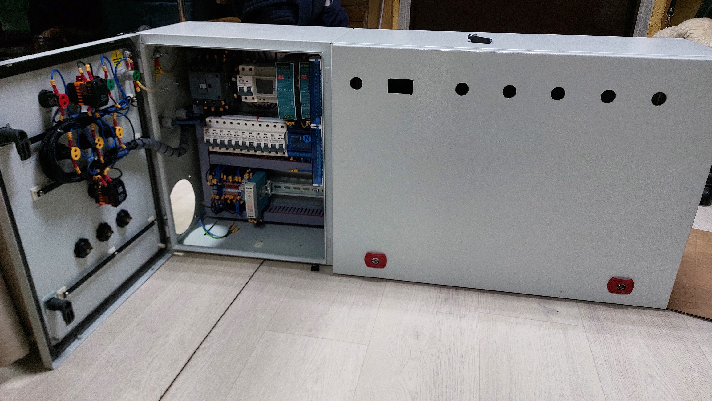 1. Схема размещения оборудования в шкафу - в малом шкафу силовая часть основная, в большом серводрайверы, частотник и контроллер с коммутацией), охлаждение сбоку слева вдув, сбоку справа сверху выдув, дополнительный вентилятор снизу в большом отсеке предусмотрен, будет выпилено отверстие, но туда можно будет всегда заглушку аккуратную сделать (общий принцип - кол-во вдуваемого воздуха должно быть больше выдуваемого, чтобы создать избыточное давление внутри шкафа), на всех вентиляционных отверстиях решетка 150х150 с фильтром.