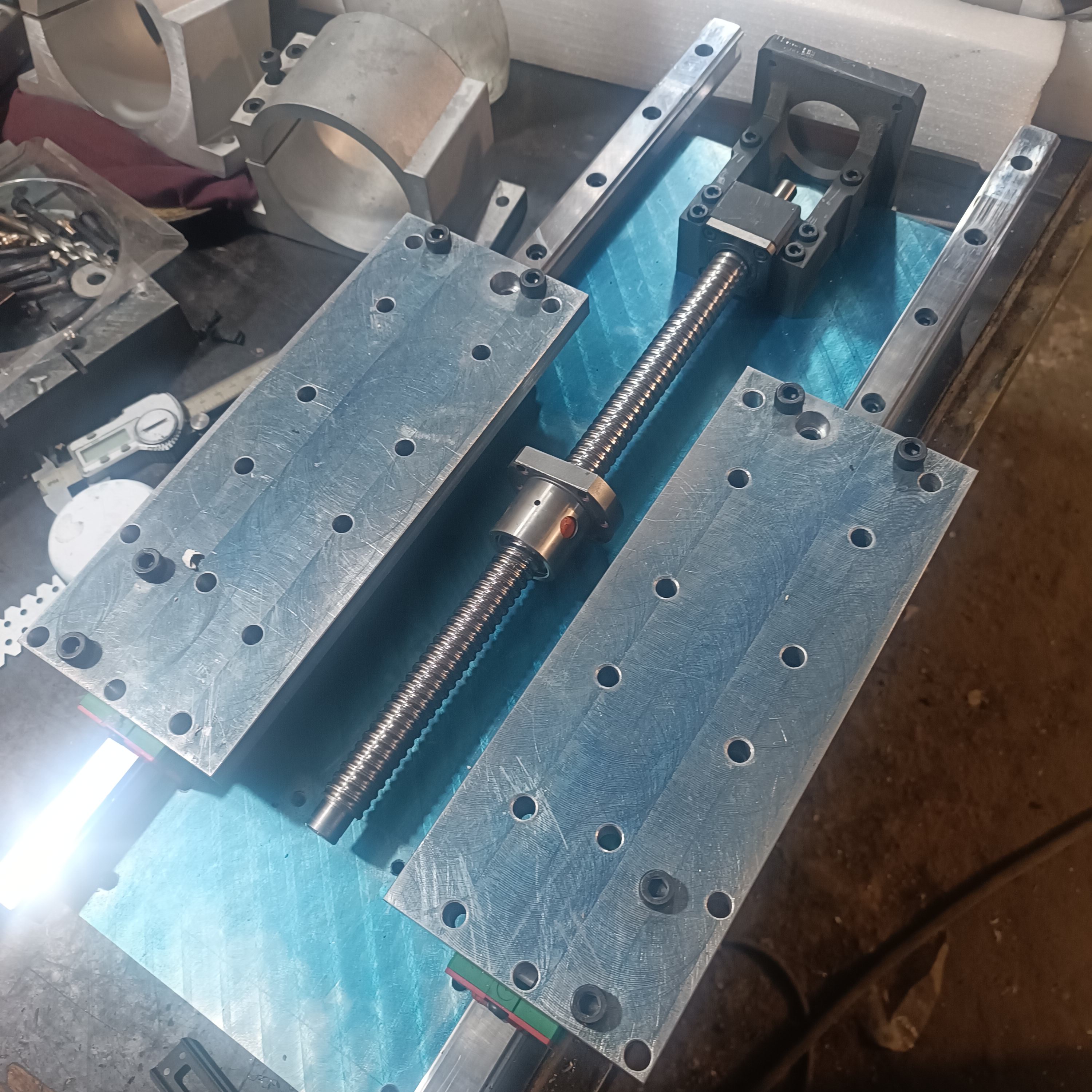 Прдолжаю стоить ось ,z. Очень хочу выкинуть китайские хомуты для крепления шпинделя , но не могу . Доступа к фрезеру нет , а детали в размер сделать просят 100тр. Думаю эти поставлю выпилю уже сам , потом поменяю.