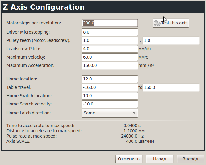 в окне настройки оси ставил знак минус перед скоростью чтобы ось ехала вниз а не вверх