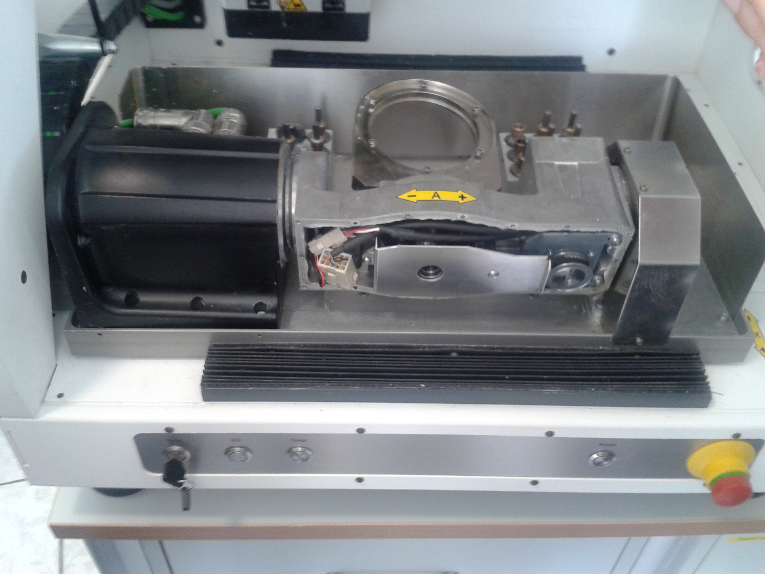 Так же и с моторами, расстояния минимизированы до предела, за счет этого не нужны дорогие сервы, хватает надежных шаговых, которые стоят на много дешевле. Теперь камера: Порскольку точат блоки прессованого оксида циркония - порошок лезет везде. В большом станке просто резинка на шпинделе, снизу никакой защиты. В маленьком - камера обработки полностью изолирована от остального пространства станка. Герметически закрывающаяся крышка, ось Х не на шптндель, а на заготовку идет. Ну и: Единственное условие: не работать с цирконом без пылесоса!