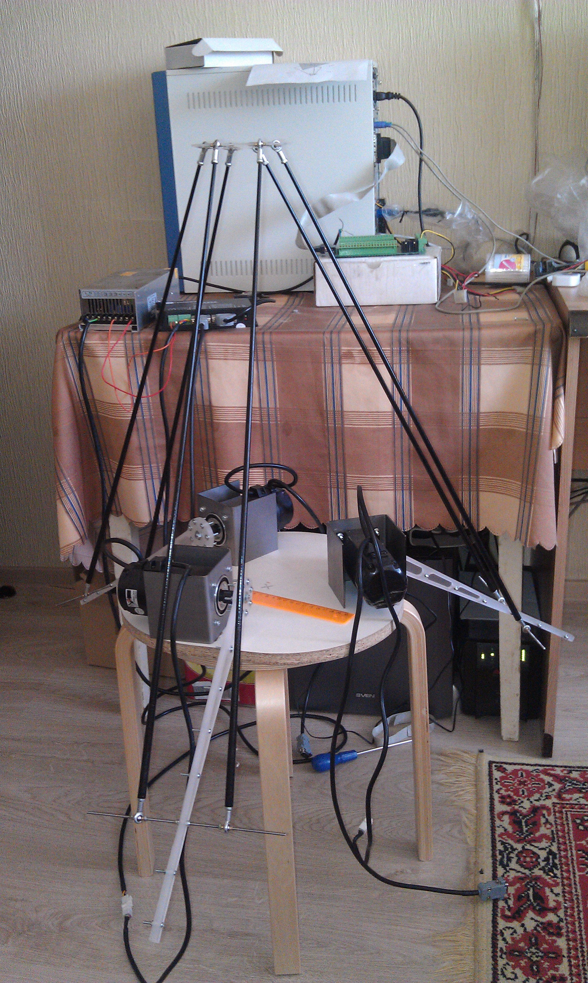 Для практической оценки возможности реализации (механики и управление LinuxCNC или если не получится то перейду на Arduino, но уже видео-система будет не актуальна), собрана тестовая конструкция - основные плечи вырезаны из оргстекла, вторые из удилища.
