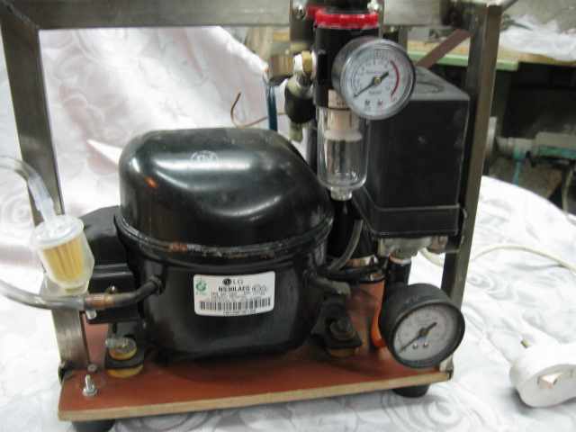 основа компрессор от охладителя воды, регулятор держит давление в рессивере 10 атм.