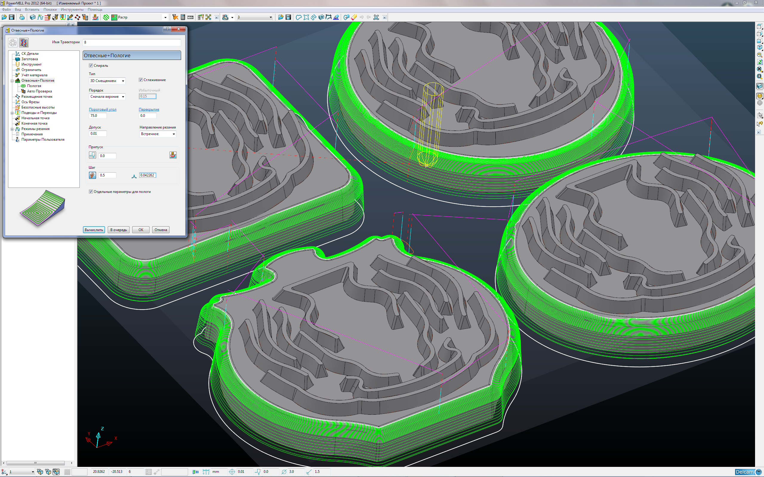 Я открыл и разместил рядом 4 модели. У моделей можно выбирать отдельные элементы, если потребуется обработать какие-то участки. 2. Создал автоматически заготовку (обычный параллелепипед). 3. Создал систему координат, указав на нужный мне угол заготовки. Активировал эту систему координат, и пришлось заново создать заготовку уже в новой системе координат. 4. Выборка "большой" цилиндрической фрезой (предварительно была создана граница вокруг деталей с учетом диаметра фрезы и припуска). 5. Доработка более тонкой фрезой (1,2 мм). 6. Обработка боковых граней гравером с чуть более острым углом конуса чем требуется, поэтому - обработка в несколько проходов. 7. Обработка плоскостей (при черновой обработке я оставил небольшой припуск). 8. Доработка более тонкой фрезой узких участков. 9. Обработка скругления и боковых стенок фрезой со сферическим концом. 10. Обрезка по контуру (в т.ч. нижней части, где сферическая фреза не достала). Картинки форум уменьшает. Вероятно, придется открывать оригиналы файлов для просмотра.