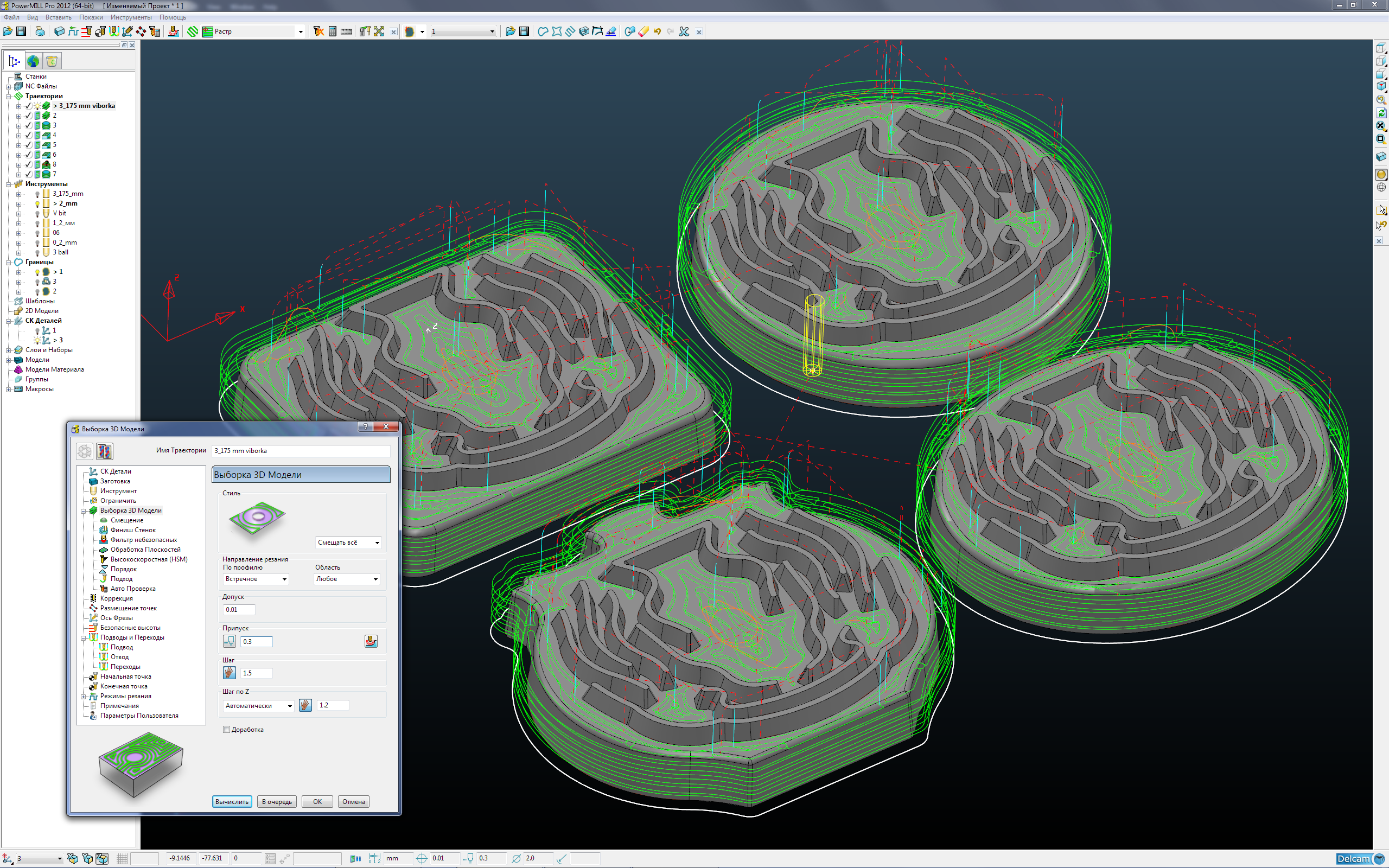 Я открыл и разместил рядом 4 модели. У моделей можно выбирать отдельные элементы, если потребуется обработать какие-то участки. 2. Создал автоматически заготовку (обычный параллелепипед). 3. Создал систему координат, указав на нужный мне угол заготовки. Активировал эту систему координат, и пришлось заново создать заготовку уже в новой системе координат. 4. Выборка "большой" цилиндрической фрезой (предварительно была создана граница вокруг деталей с учетом диаметра фрезы и припуска). 5. Доработка более тонкой фрезой (1,2 мм). 6. Обработка боковых граней гравером с чуть более острым углом конуса чем требуется, поэтому - обработка в несколько проходов. 7. Обработка плоскостей (при черновой обработке я оставил небольшой припуск). 8. Доработка более тонкой фрезой узких участков. 9. Обработка скругления и боковых стенок фрезой со сферическим концом. 10. Обрезка по контуру (в т.ч. нижней части, где сферическая фреза не достала). Картинки форум уменьшает. Вероятно, придется открывать оригиналы файлов для просмотра.