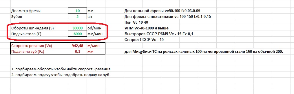 Это я еще подачу на зуб взял 0,1 на некоторых сплавах рекомендуют до 0,4 то есть скорость можно раза в 3 увеличить