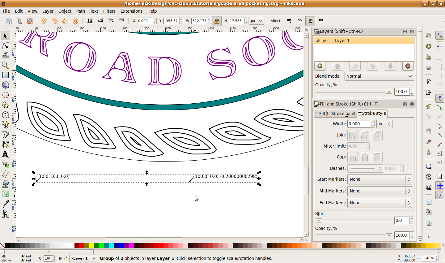 The hardest thing while calculation pocketing is to offset the path. It's really hard to be calculated and often gives bad result. For simple paths offset could be easier and for them you could try to use Gcodetools axiomatization. But this path is really bad one, so we'll better offset it by hand.