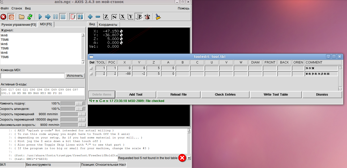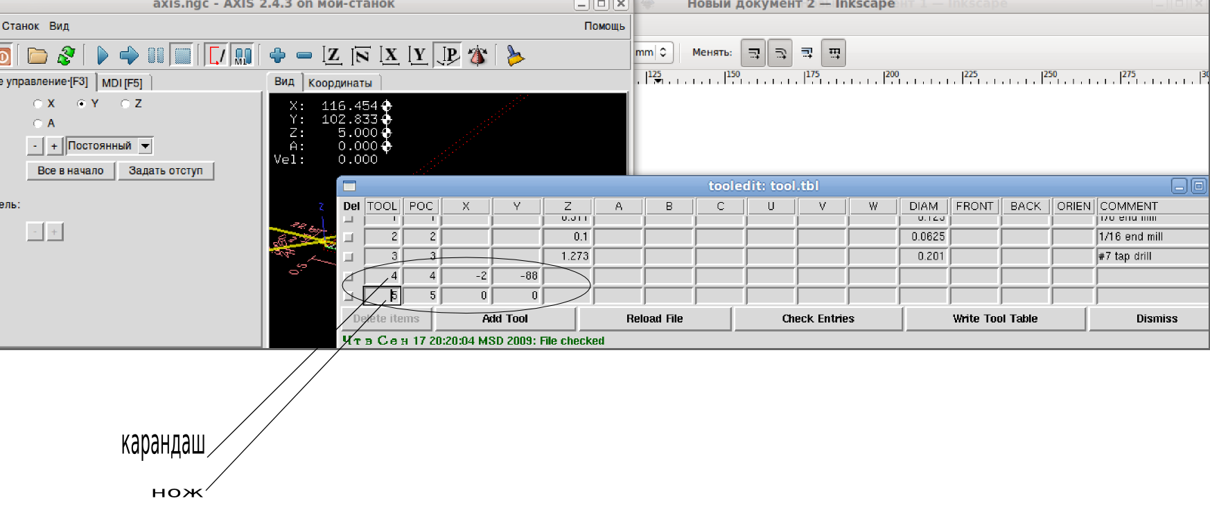 Подвел суппорт в нужную точку на столе. И мне нужно обнулить х у, а как вызвать заданный инструмент? Под номерами 4 и 5 - карандаш и нож.