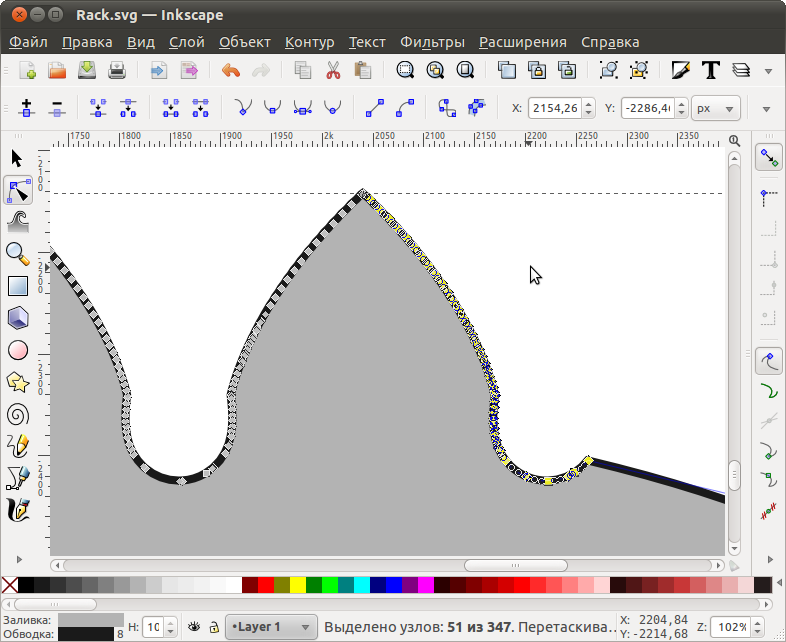 в. И объединяем концы копий (кнопа под указателем мышки): 14. В итоге получаем, этот контру можно экспортировать в Gcode при помощи gcodetools: ЗЫ этот контур лучше не преобразовывать в ломанную, т.к. снизу достаточно большие промежутки. Если будет плохо экспортиться, можно использовать Расширения - Изменить контур - Добавить узлы, выставить там По максимальной длине сегмента (размер подбирать по месту). И потом преобразовывать в ломанную.