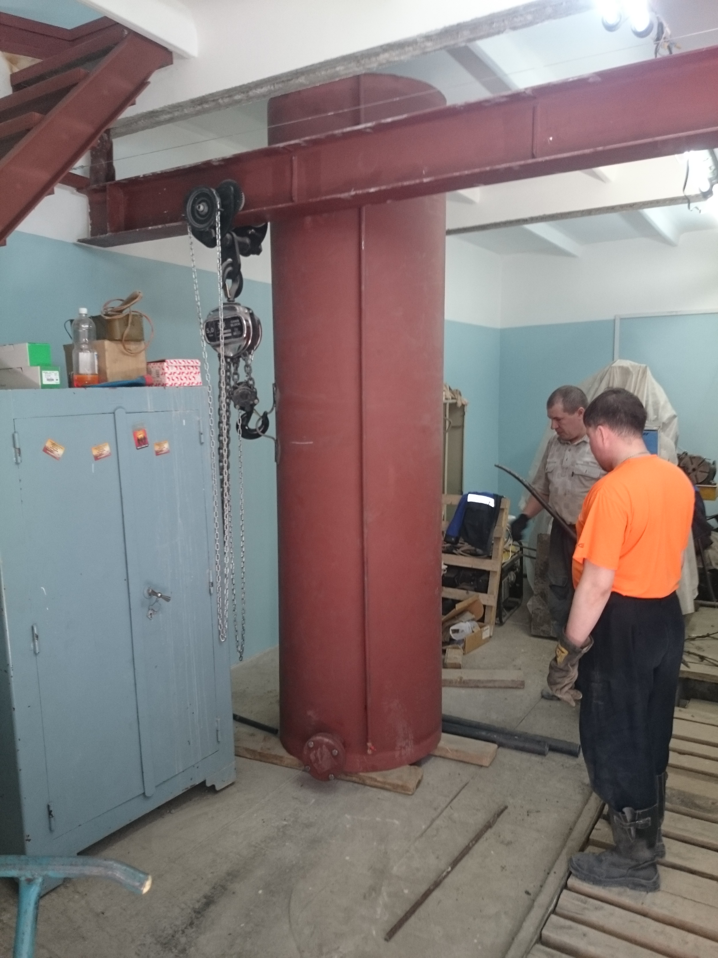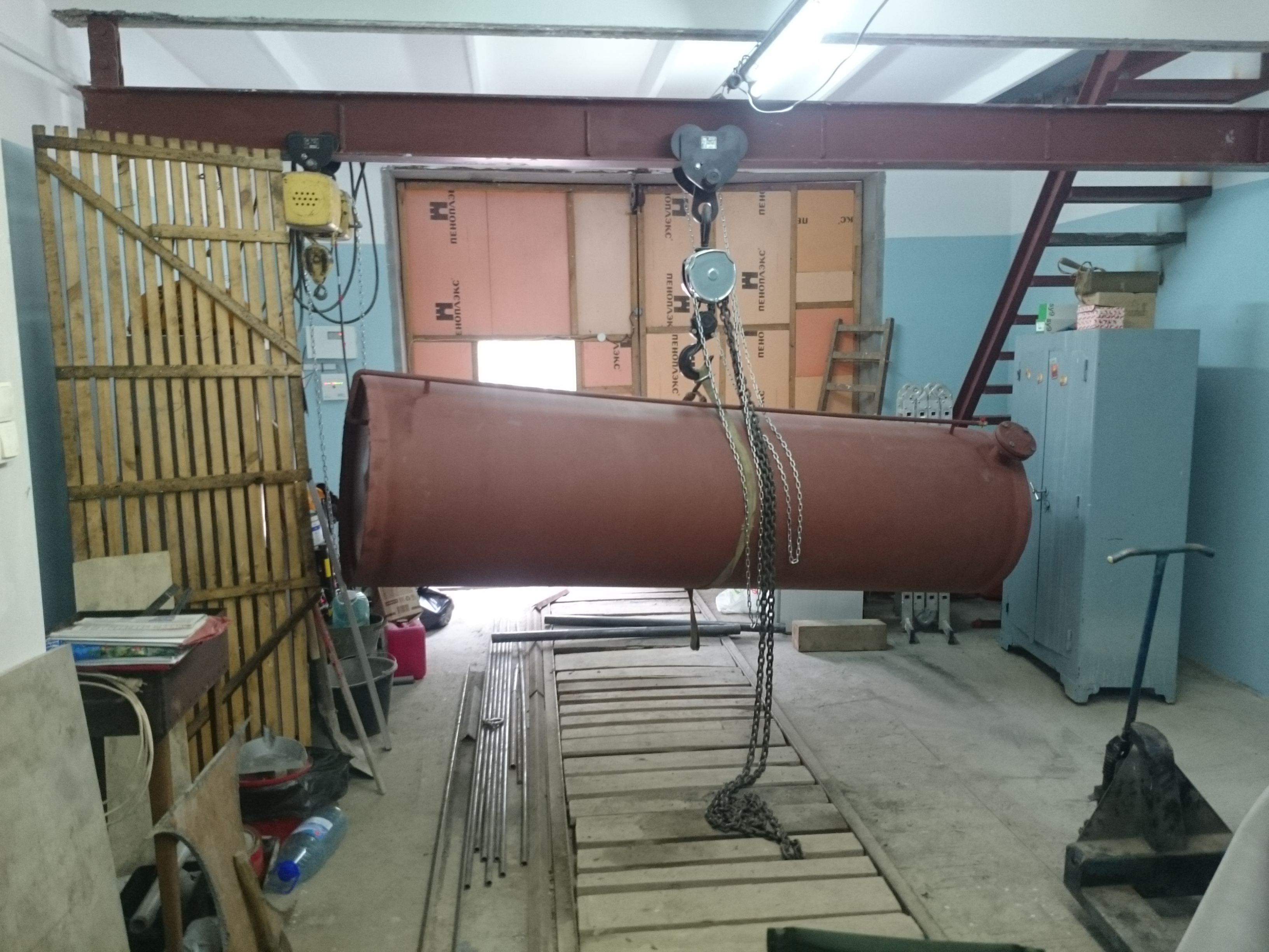 Из трубы диаметром 820 мм сварена емкость на полтора куба. По расчетам должна вроде влезть. Но поднять таль до конца не позволяет. А у нас же еще одна есть! Варим уши по бокам.. пошла родимая! вот так. готово, обвязываем.