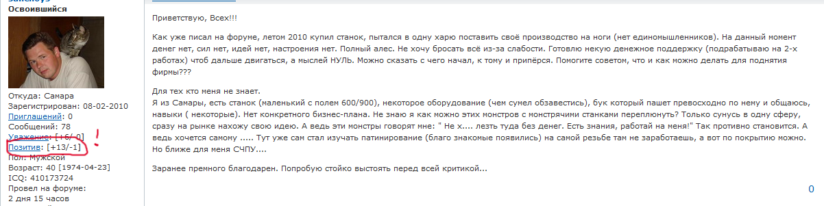 Вообще-то на том форуме "Позитив" - это автор того сообщения поставил кому-то плюсы за сообщения, т.е. он поставил 13 плюсов за другие сообщения. А за его сообщения поставили 6 плюсов. Но за данное конкретное сообщение ему вообще плюсов никто не ставил, там видно в правом нижнем углу - ноль.verser писал(а):У меня вызвало улыбку сочетание текста того сообщения с оценкой позитива автора +13