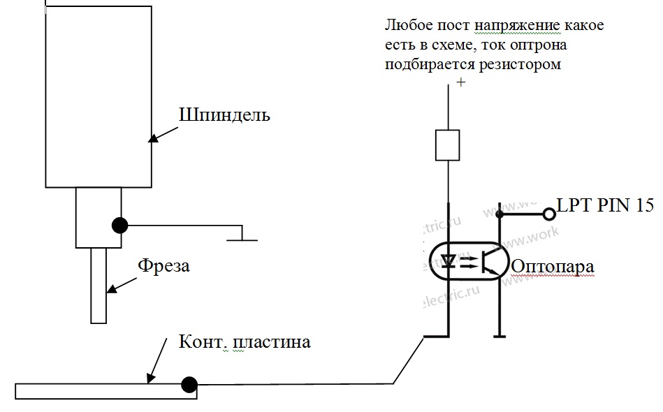 Схему нужно собрать так, чтобы при замыкании шпинделя и пластины через оптопару и токоограничивающий резистор потек ток от батарейки (это будет левая часть схемы).