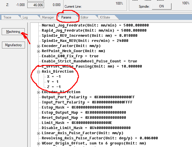 В обведенном месте меняешь 1 на -1 или наоборот. Закрываешь. Пробуешь после перезагрузки Ncstudio. Устроило - оставляешь. Не устроило снова меняй. Для каждой оси.