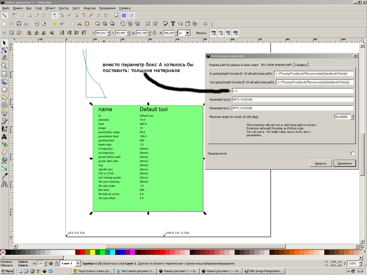 Выбери инструмент tangent knife в tools library, и лучше всего сделай шаблон - Сохраняешь полностью настроенный svg в директорию templates (рядом с extensions) и потом Файл-Новый-и выбираешь свой шаблон.boxxx2006 писал(а):вылетала зеленая таблица с моими параметрами для ножа?