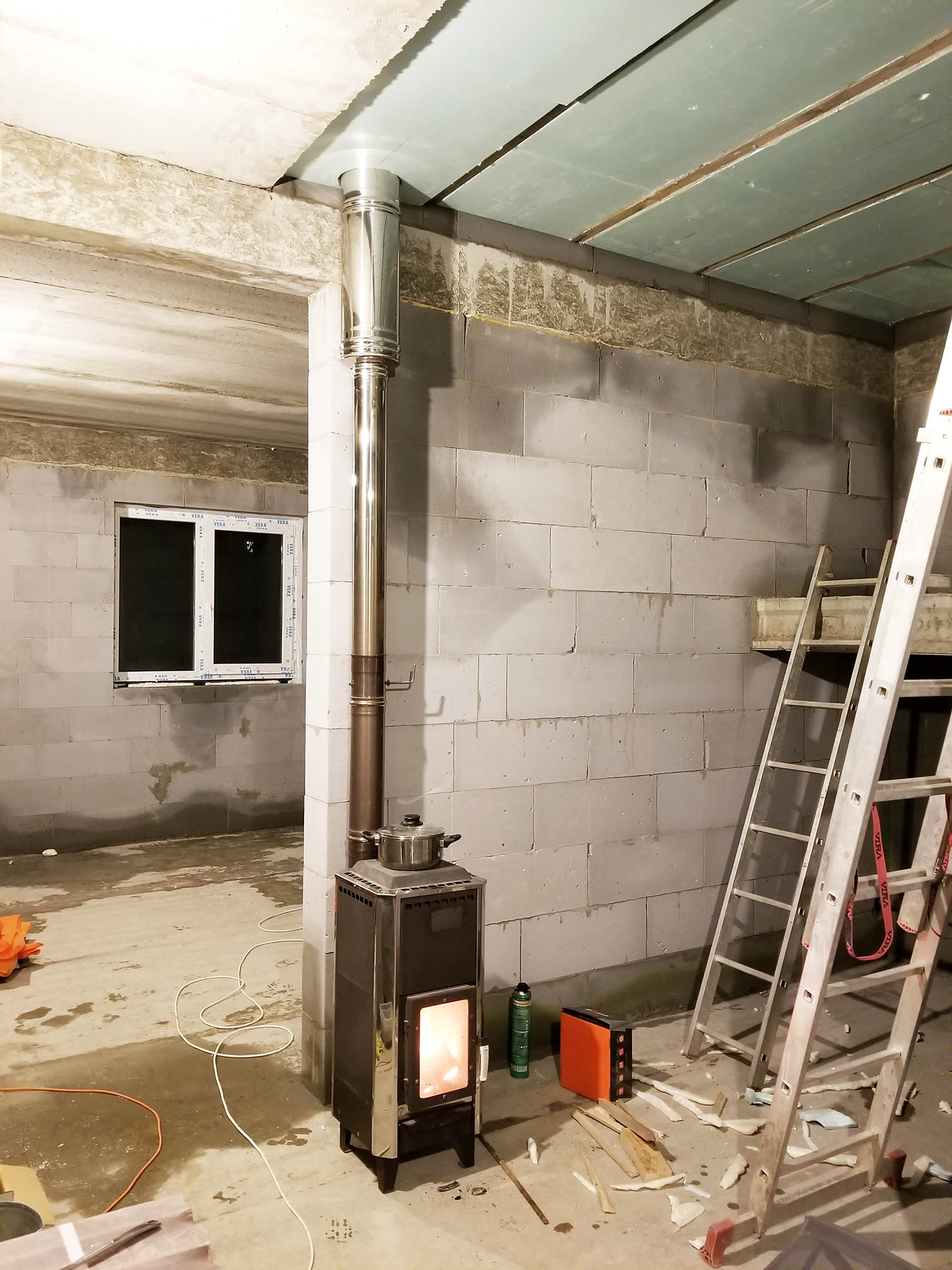 Электричества пока нет. Закрыл пенопластом проем на второй этаж. Притащил печку из сарайки. Стало намного веселее
