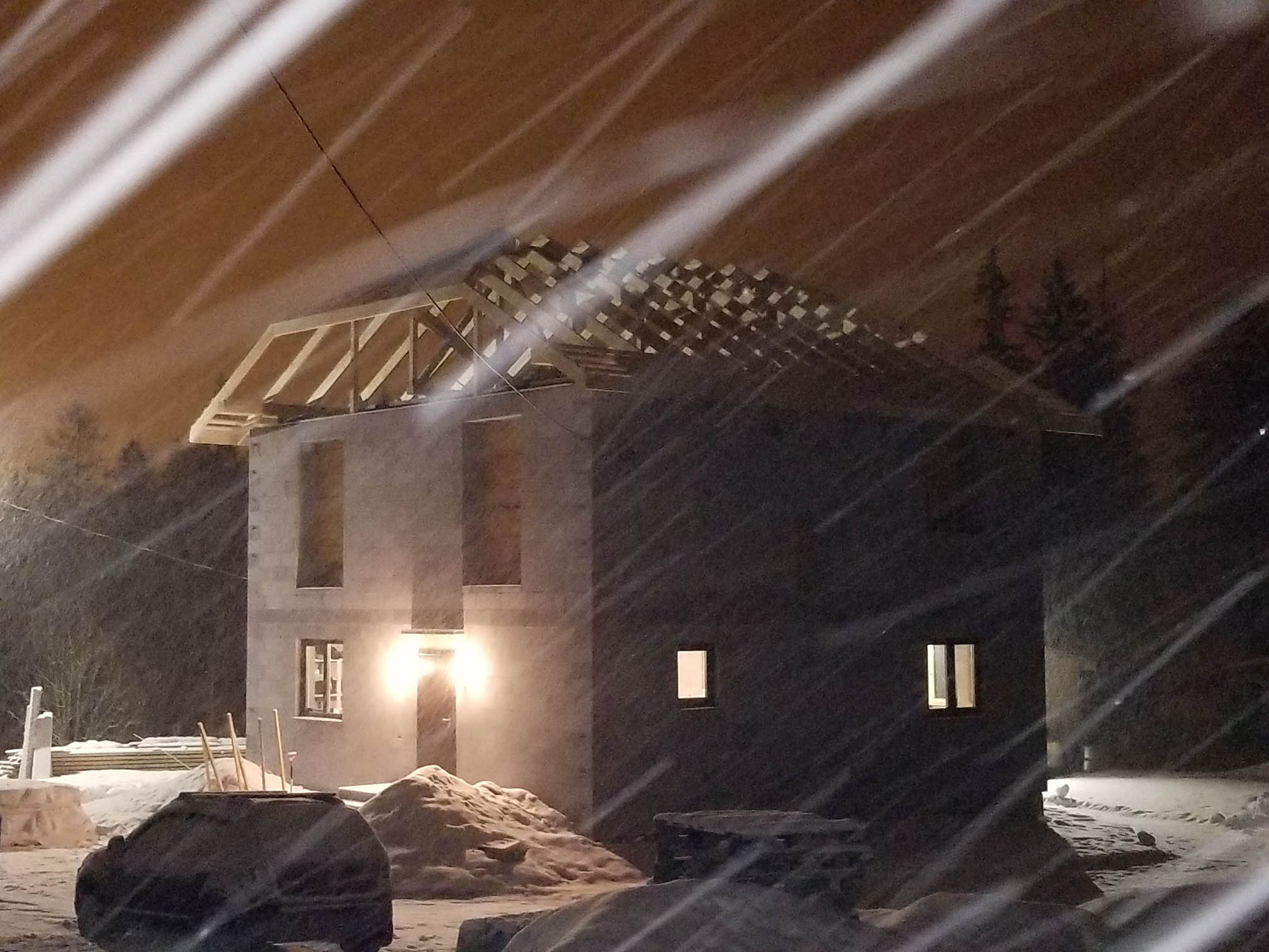 Проблемы зимой были только с тем, что 50% времени я тратил на уборку снега. И очень сложно было разделить смерзшиеся в единую глыбу блоки, сильно промокшие под осенними дождями. Один из поддонов отогревал двое суток, чтобы разделить. Армопояс залил обычным (не зимним) бетоном, проложив греющий кабель на 5 кВт. Одновременно в доме начал утеплять пол: