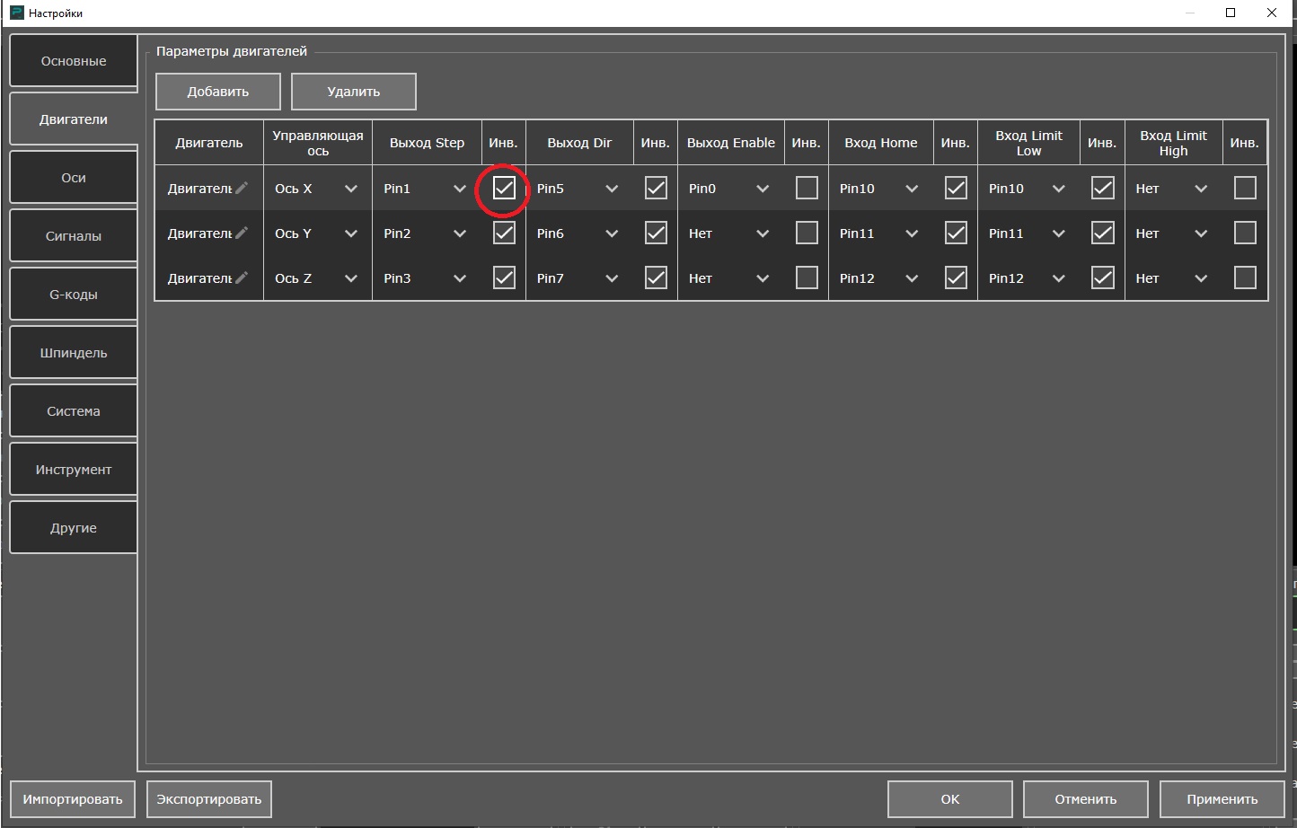 foto-boss писал(а):Убегала ось Z вниз. После изменения полярности сигнала STEP для этой оси в настройках PUMOTIX, ось стала убегать вверх.