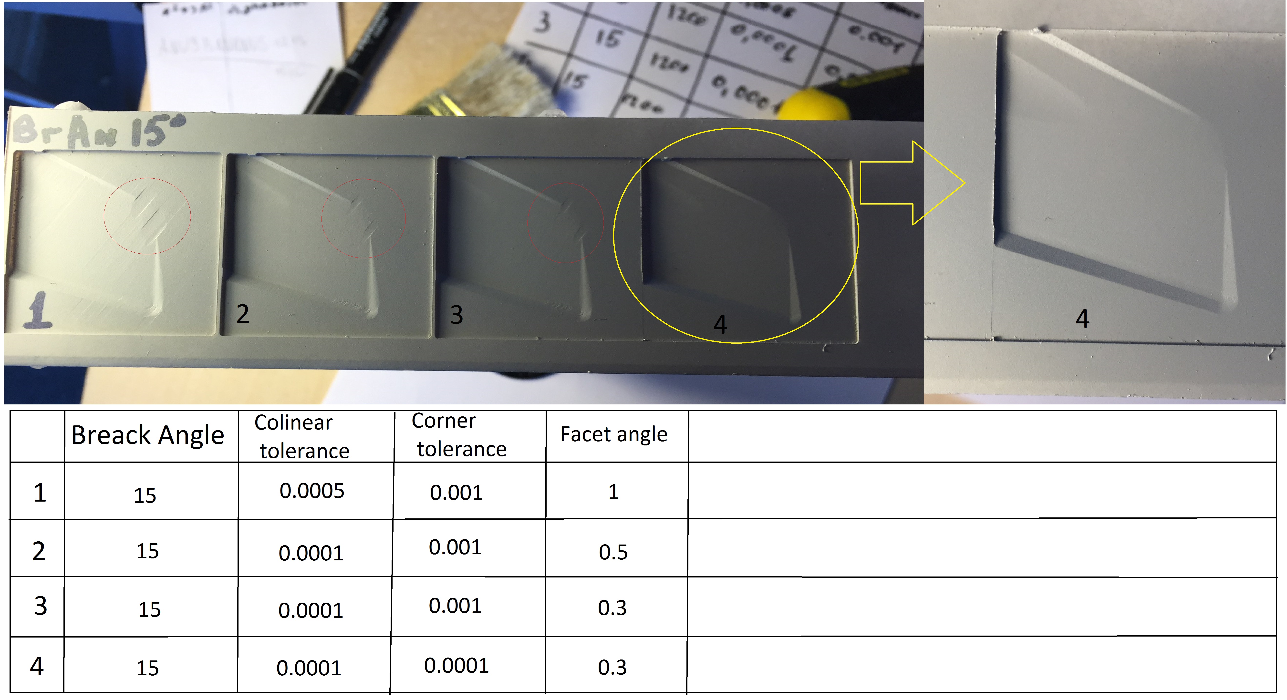 Сделал тестовую заготовочку, на которой испытывал разные настройки планировщика. Удалось победить проблему). Фреза концевая 1мм. Подача 1200мм в минуту. Под номером 4 деталь соответствует модели.