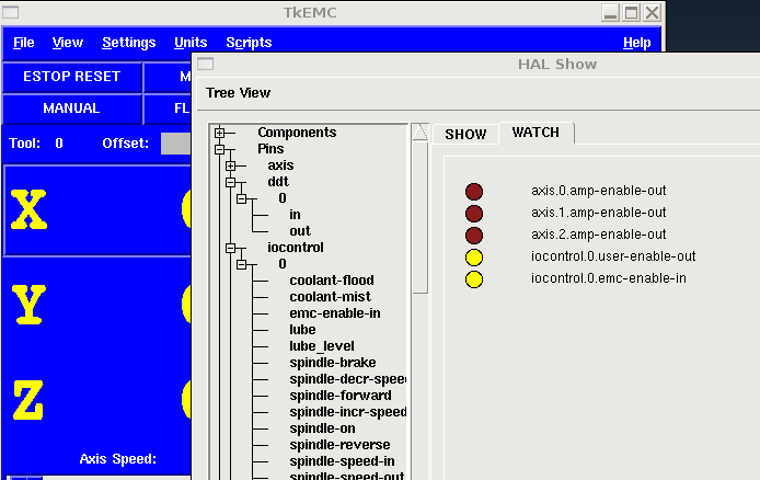 Watch позволит вам быстро протестировать ваши датчики или посмотреть влияние изменений, которые вы сделали в EMC использую графический интерфейс. Частота обновления Watch слегка медленновата для того, чтобы увидеть импульсы шагов шаговых двигателей, но вы можете использовать его для этих целей, если вы двигаете ось очень медленно или на маленькие дистанции. Если вы использовали IO_Show в EMC, страница Watch в halshow может быть настроена для наблюдения за параллельным портом очень похоже на то как это делал IO_Show.