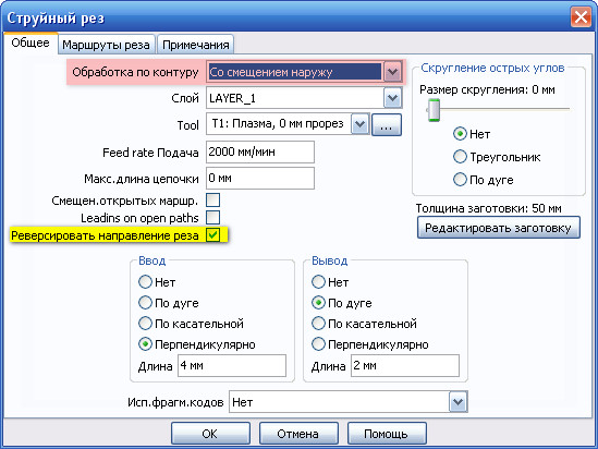 Нащупал. Оказывается переключается включением галочки "реверсировать направление реза". Как бы логичнее, по моему, было бы переключать "обработкой по контуру". Фигня какая-то. В принципе работает. Только если надо будет поменять направление реза, то придётся в постобработчик лезть.