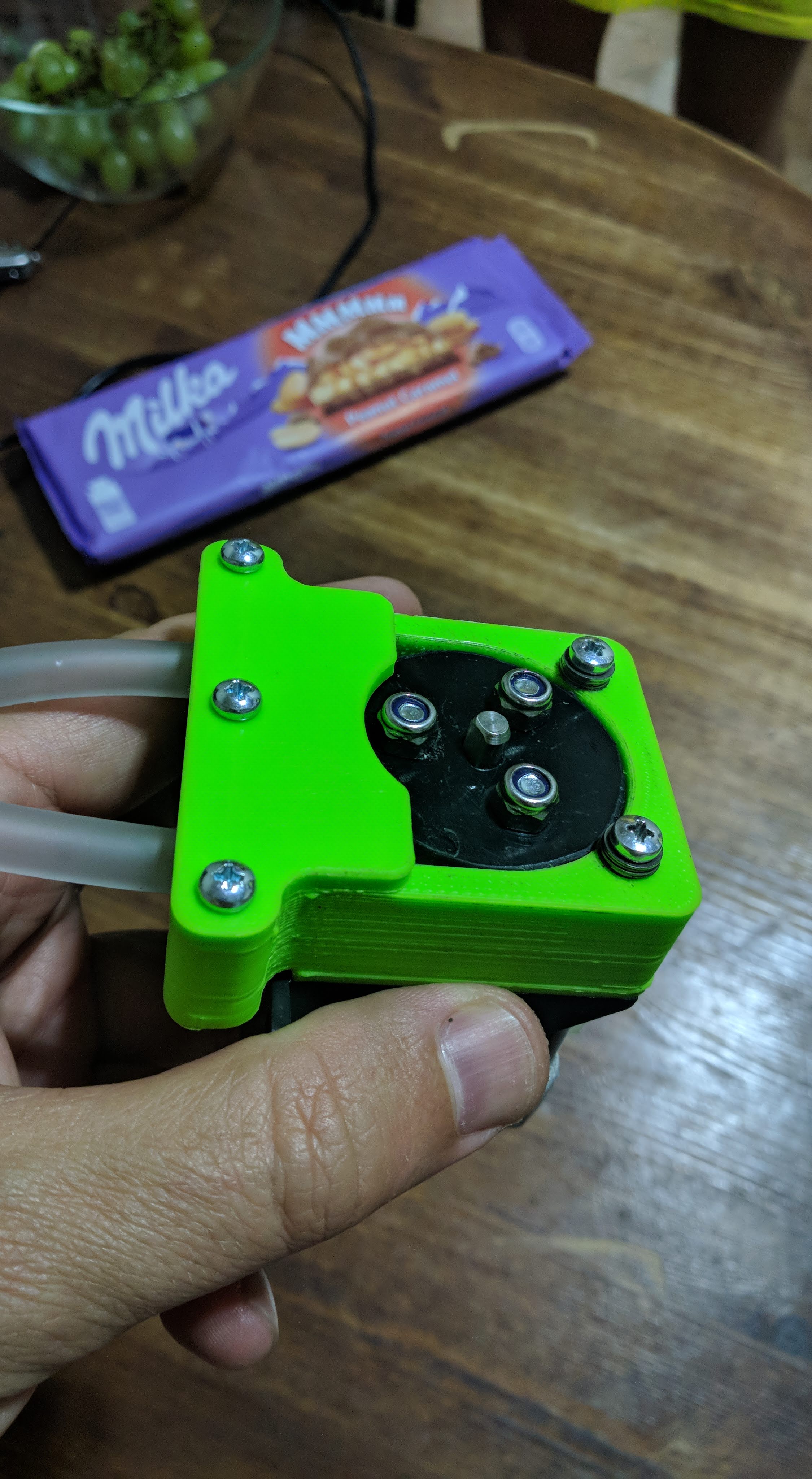 Поставил 6 роликов а не 3 как в их инструкции, плюс расковырял прошивку, потому что не работало так как положено + исходники у них кривые и косые, корректировал модели и делал с нуля в солиде всю систему пережима трубки. В итоге работает, правда жужжит - подшипники игольчатые явно не под 4 мм штифт сделаны, а немного больше. Ну и микрошаг там 1/4, буду менять на 1/16.