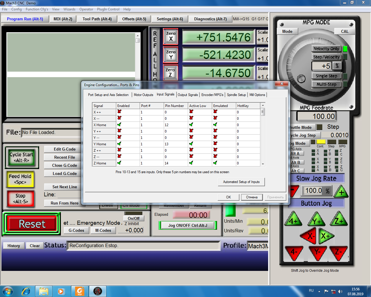 Все оси сразу заработали но ось У ни в какую! Причем подчиненная ей ось А работает нормально а основная ни в какую. Меняли местами моторы, редуктора, БП, драйвера- ни в какую. Но в итоге причина нашлась. Два провода идущие с оптоплаты на драйвер поменял местами и ШД стоял на удержании. Вот так. Сделал вывод- надо быть внимательней! Но по ходу возникли вопросы, большая просьба помогите разобраться! А именно: Не работают датчики Хома. Причем они срабатывают(светодиод на них зажигается) но ШД не останавливаются. Е-Стоп работает! Подсоединено все вроде правильно, несколько раз перепроверял. И не включается шпиндель с Мача. В ручную работает. Ниже скрины Мача, может кто подскажет что? Заранее спасибо!