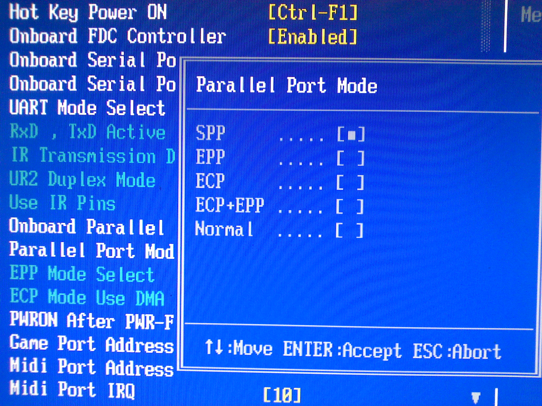 Fiks писал(а):Вот еще, какой стандарт порта LPT установлен в BIOS?