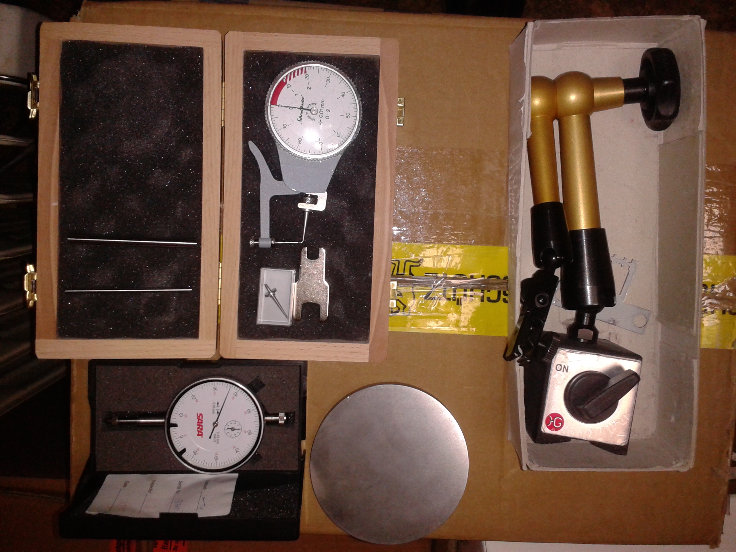 Мой калибровочный комплект. Концевой микрометр, микрометр толстомер, магнитная рука для концевого микрометра, пины 3 и 6 мм для калибровки шпинделя и оси Z, шлифованый диск для калибровки осей Х и У (точно соответствует рабочему полю стоматологического расходника).