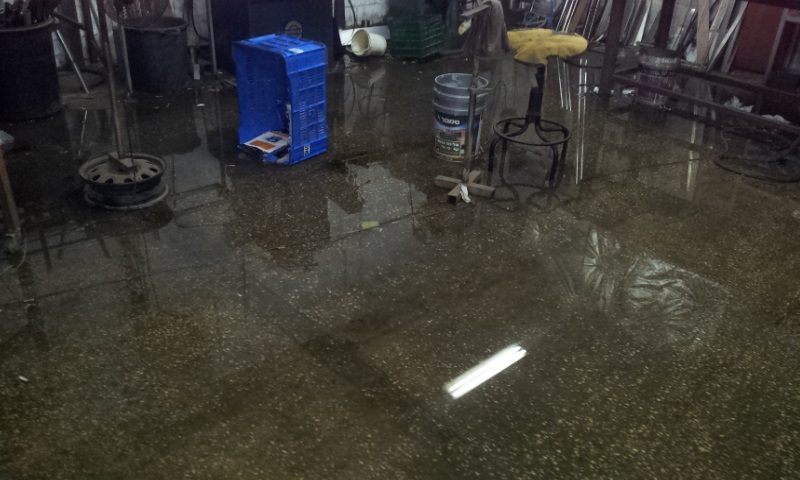 сначала вроде не текло, а потом когда дощь усилился, потекло рекой, прям в ворота, оказывается соседи, через забор. подняли у себя уровень бетона... глубина водя в центре цеха около 6см