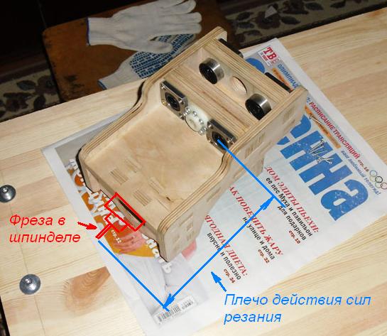 Дело не в распределении веса, а в размере плеча действия силы резания относительно точки закрепления каретки (см.рисунок). Т.е. даже при небольшом усилии на конце фрезы в Вашей конструкции на подшипники будет действовать относительно большой момент (за счет большого плеча). А учитывая близкое расположение подшипников, момент сопротивления моменту от сил резания будет небольшим. Плюс к этому вся эта консоль (от нижнего подшипника до фрезы) сама по себе избыточной жесткостью не страдает. В общем гнуть эту конструкцию будет сильнее, чем могло бы, увеличь Вы расстояние между подшипниками хотя бы раза в два (нижние подшипники ближе к низу каретки)....sailanser писал(а):Тут надо учитывать еще и такой фактор что шпиндель имеет вес. Вот как пример у меня стоит сейчас Kress 1050 FME у него центр тяжести внизу и как раз все нормально получается равнораспределенный вес.