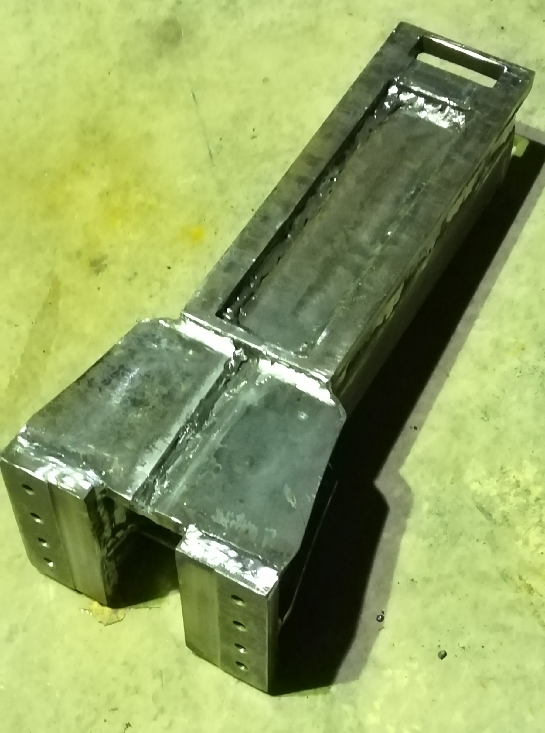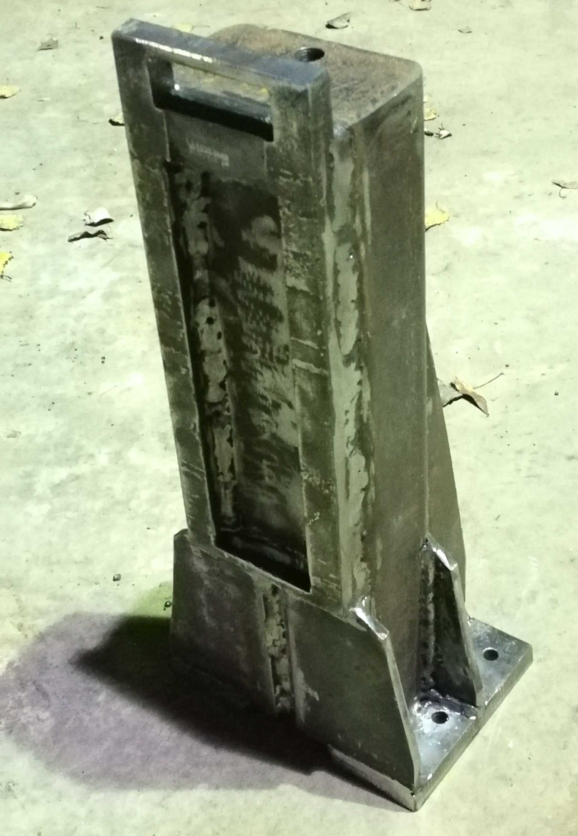 Колонну сварил и зачистил. Чуть изменил конструкцию в процессе сварки. Все технологические перемычки срезал, а одну верхнюю оставил в качестве ручки. Очень этому рад остался, без ручки эту штуку переносить жутко неудобно. Уж больно тяжеленная получилась.