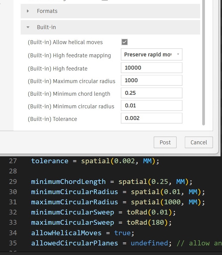 Приветствую. Я начинающий и пока многое не понимаю. Пока хочу свой 3d принтер приспособить для мелких 2d фрезерных работ. Во F360 делаю модель, получаю траектории обработки, сохраняю в постпроцессоре. Вроде всё хорошо, но вот что беспокоит. По gcode наблюдаю слишком высокую дискретность перемещения фрезы и не могу найти как повысить плавность обхода кривых траекторий. Все возможные настройки Tolerance накрутил до минимумов.