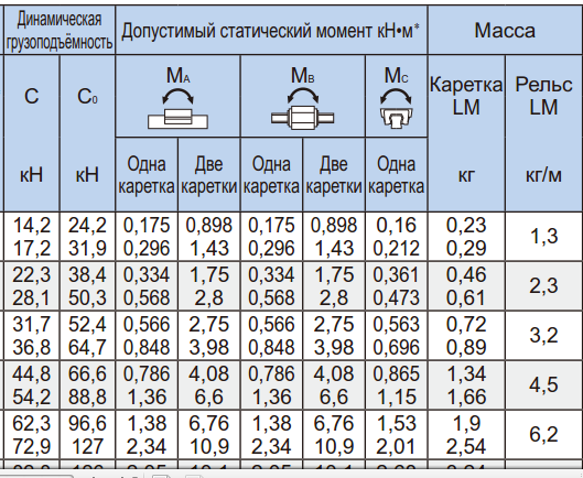 есть такая инфа. при рядом расположенных каретках и при всем этом я бы предпочел 2 каретки 15 чем 1 30. по восприятию момента, по удобству (габарит, монтаж и т.п.) и цене, особенно если немного разнести каретки...Lafayette писал(а):Самое интересное, что на роликовых каретках, при использовании 2 шт. на рельсе, есть в доках нагрузки и увеличивается она(если память не изменяет) почти в 6 раз.