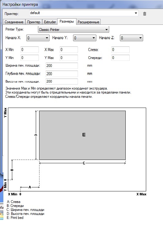 Добрый день! Вроде настроил, разобрался с шагами на мм масштабами и т.д. Столкнулся с проблемой пытаюсь настроить Репетиер так, что б вообще парковку исключить начало печати (рисования) с X0 Y0. А то прежде чем рисовать проезжает ровно по вертикали определенное количество мм (к стати гораздо большее чем позволяет мое поле..) и только потом начинает рисовать. Поле печати (рисования) настраиваю 200 х 200 мм. В настройках выбрал "классический принтер" и внем уже настраиваю размеры.