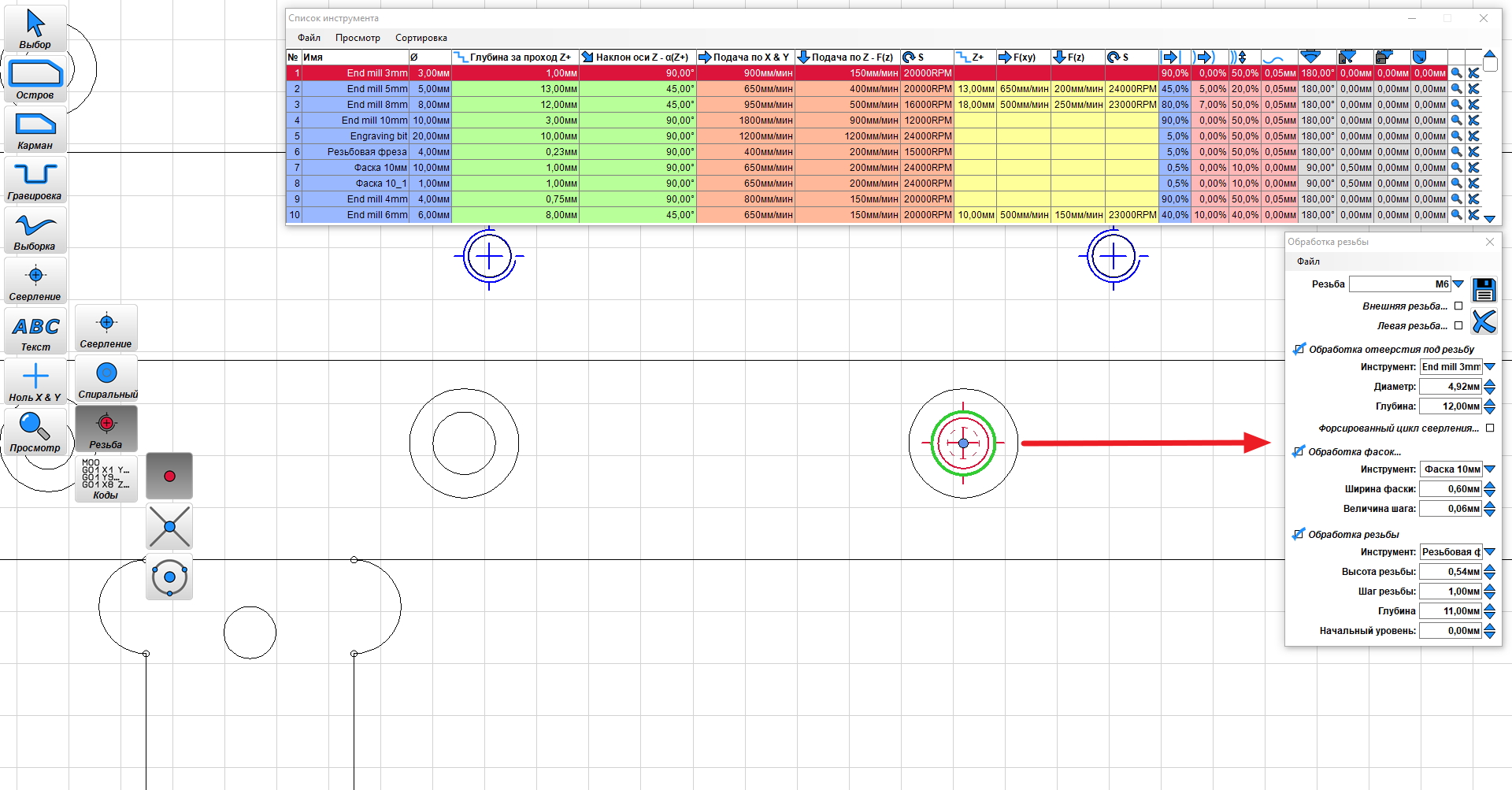 Добавлю printcreen из проги ESTLCAM для нарезки резьбы:Hugo писал(а):Попробуйте программу Estlcam там резьба элементарно делается, ничего тюнинговать не надо, сразу набор: сверловка винтовая, фаска и резьба... только выбрать - какой размер резьбы и всё! Все допуски, шаги, глубину, можно под регулировать